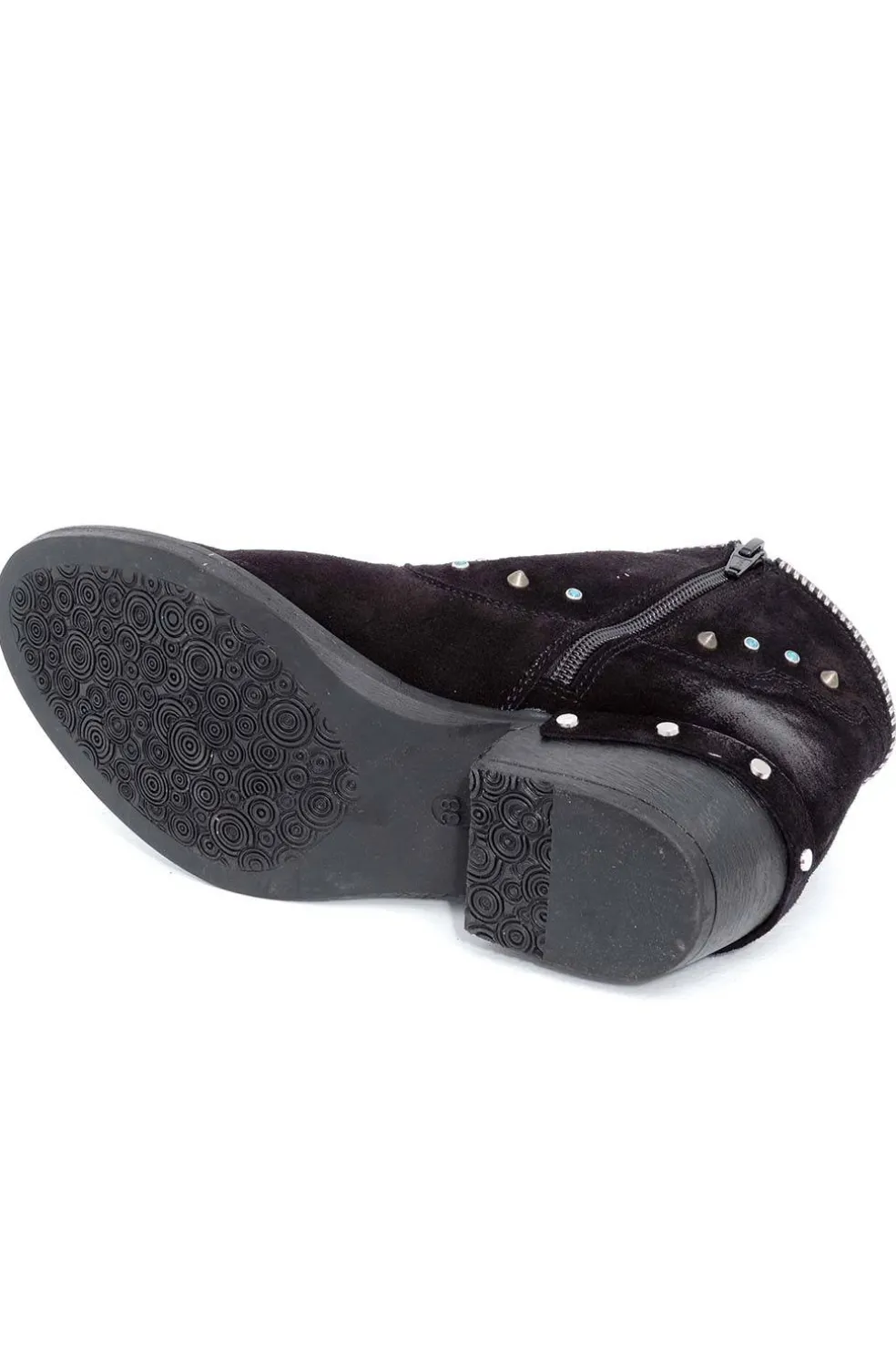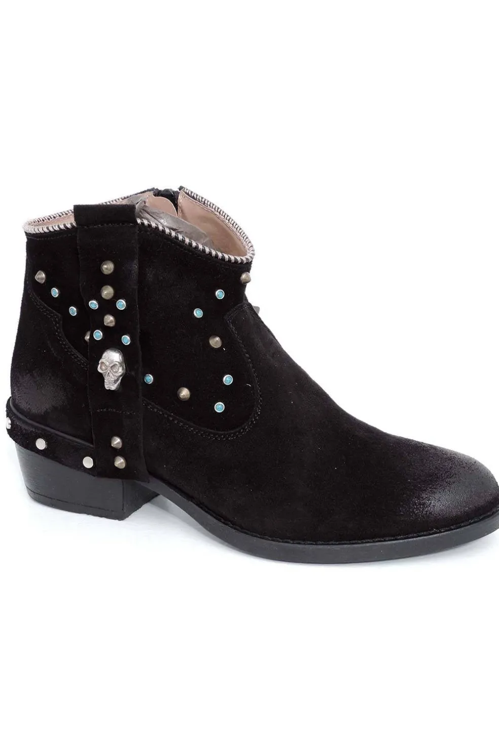 Botín de mujer en ante con adorno de tachuelas, turquesas y calavera.