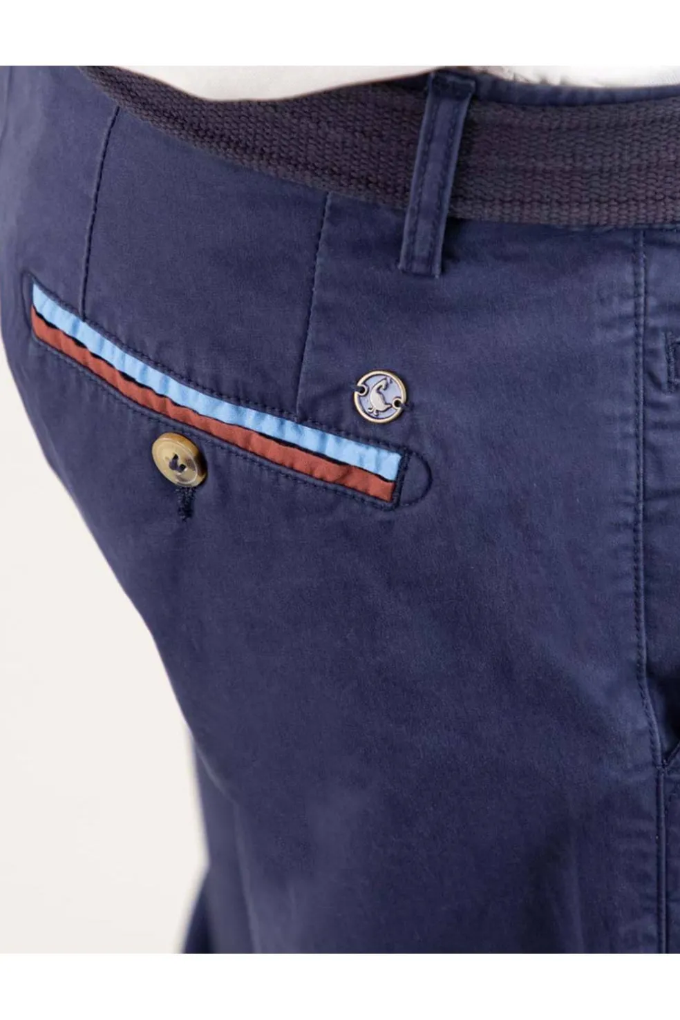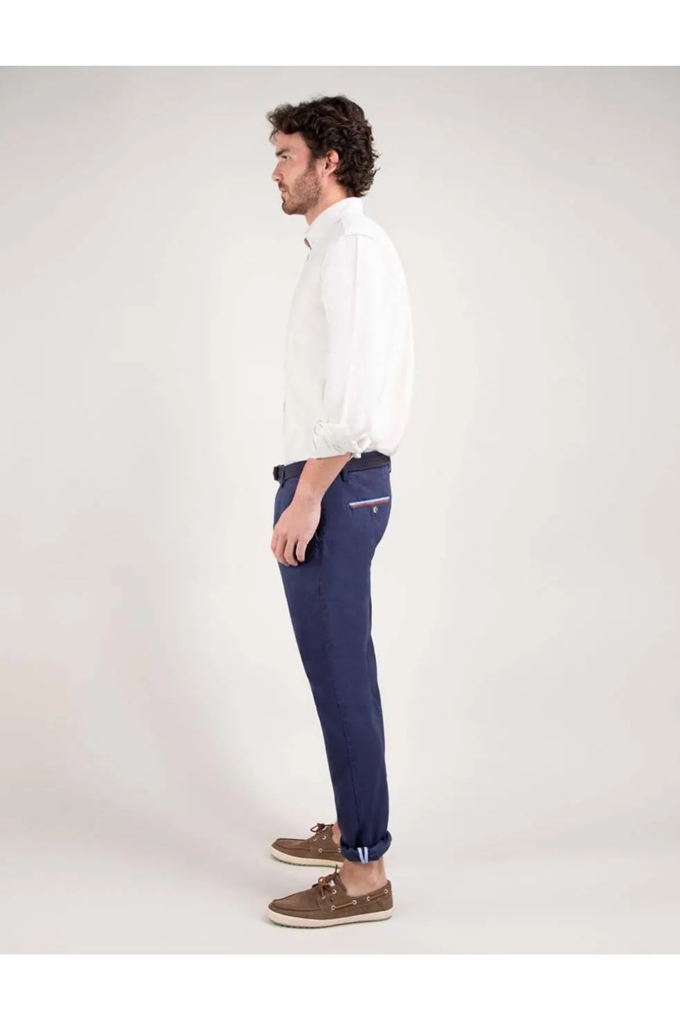 Pantalón chino de hombre confeccionado en tejido gabardina con 78% algodón, 20% de algodón reciclado y 2% elastano. Lleva un proceso de tintado que le da un aspecto desgastado. Corte Slim Fit, cierre mediante cremallera oculta por tapeta y botón. Tiene bolsillos delanteros y en los traseros lleva vivo en tejido principal con un piping a contraste. Lleva también como detalle en el bolsillo cerillero. Tiene el chapón del logo cosido encima del bolsillo trasero. Incluye cinturón de canvas.