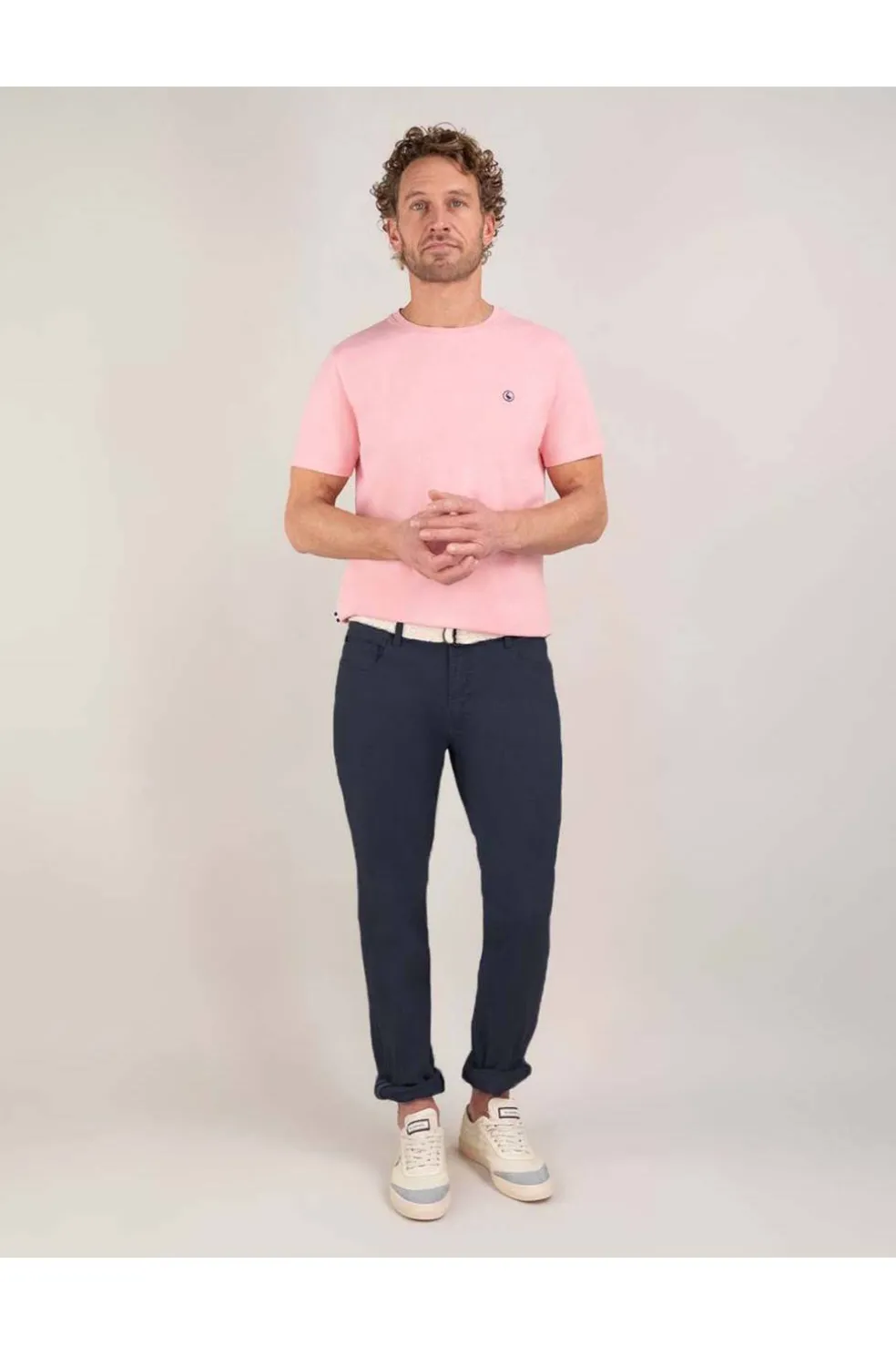 Pantalón 5 bolsillos de hombre confeccionado en tejido de sarga con 77% algodón, 20% de algodón reciclado y 3% elastano que aporta un mayor confort y un fit más cómodo.