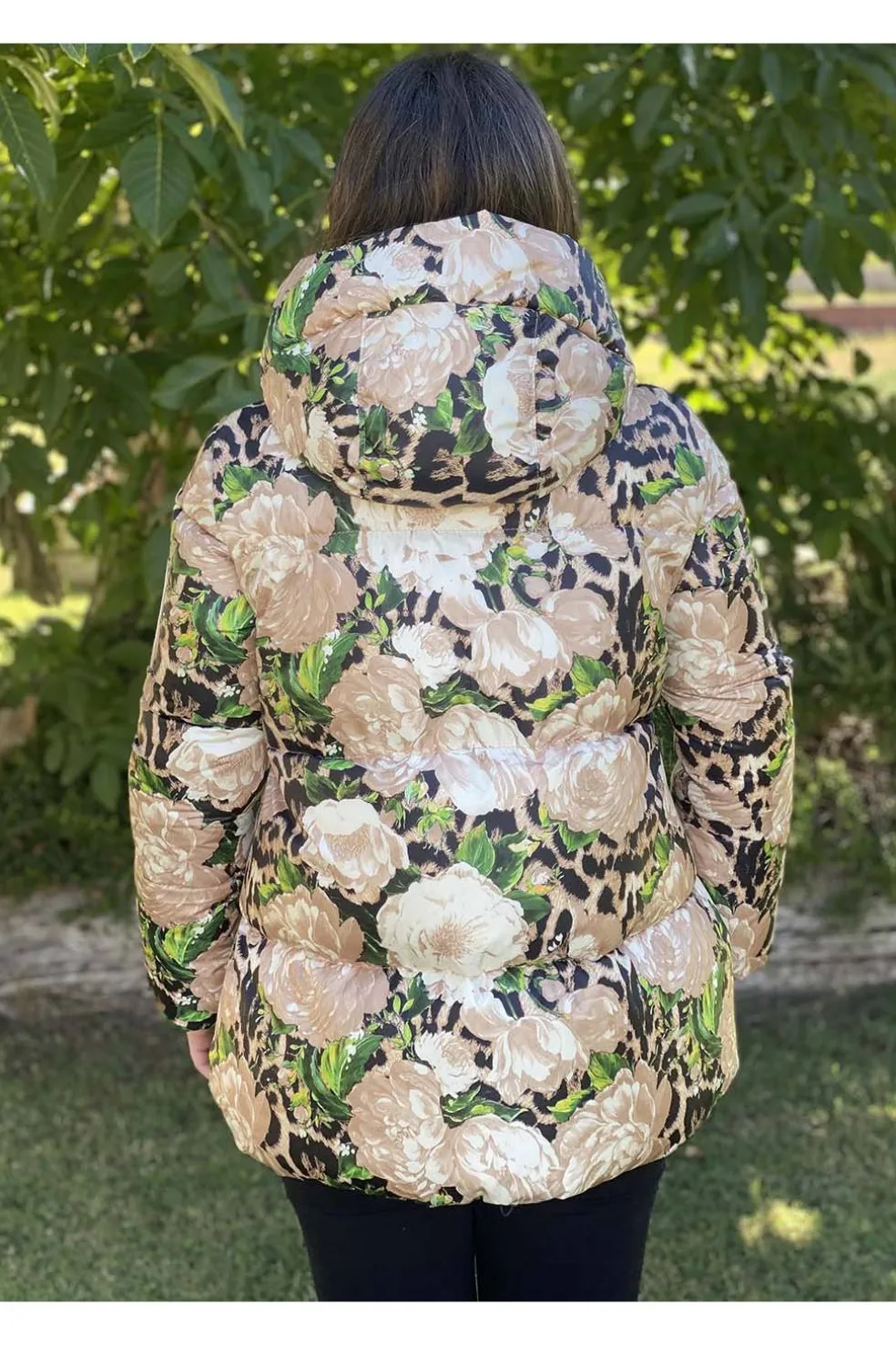 Parka mujer de Flo-Clo con capucha, combinación de colores verde, negro y beige.