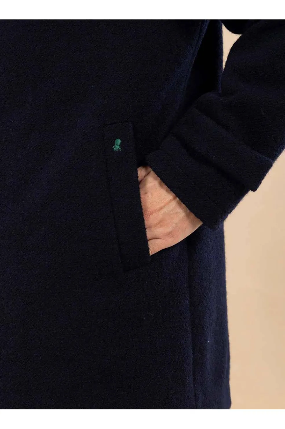 Parka de abrigo con capucha. Tejido de paño de punto rizado. Parte interior sin forro, totalmente rematada. Cierre con cremallera oculta. Acabado suave y elegante. Botones grabados con el logotipo de elPulpo. Bordado del logotipo en la pieza del bolsillo izquierdo. Parche bordado a tono en la manga.