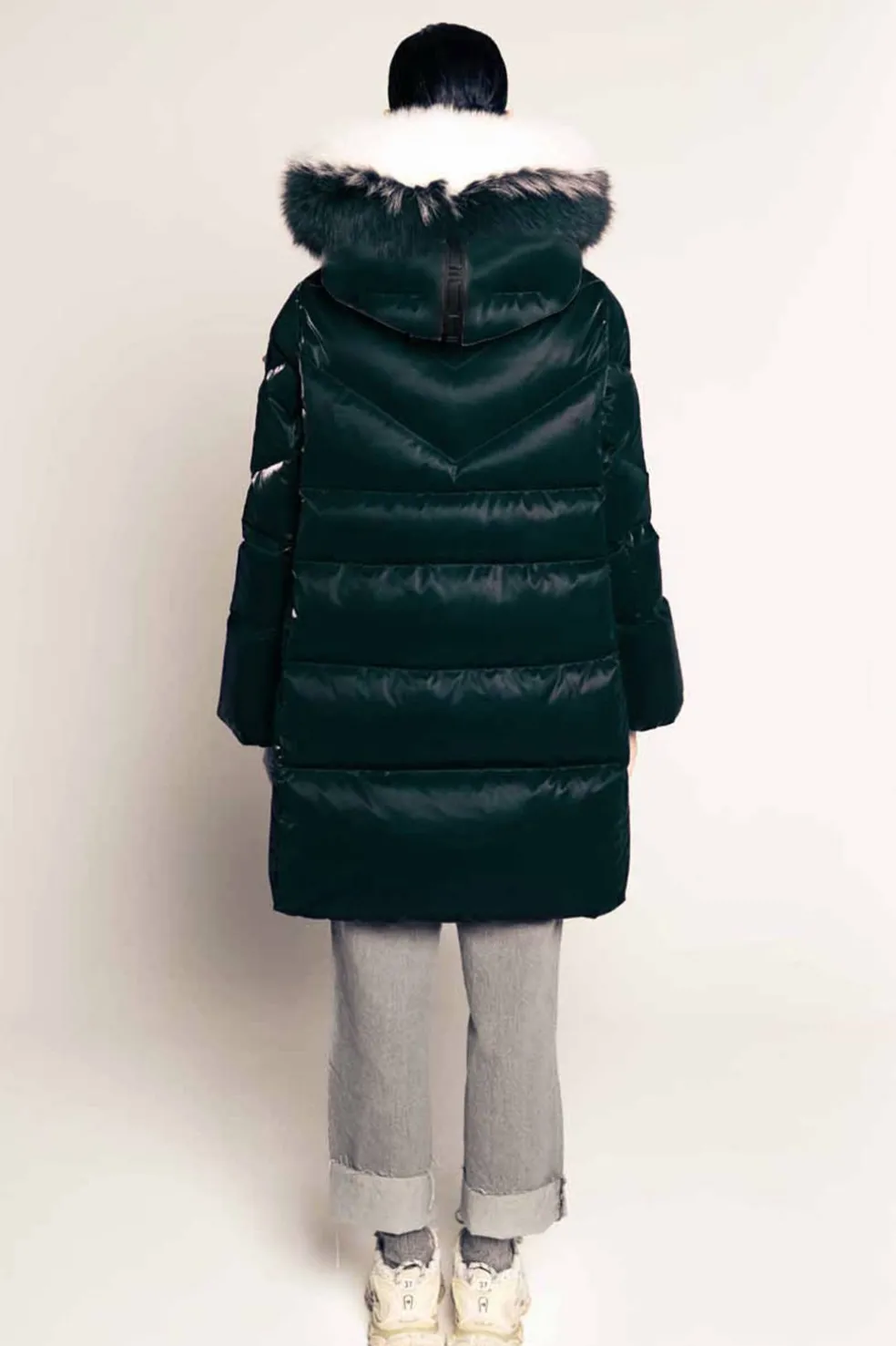 Parka de mujer de la marca Dichi, confeccionada con relleno de pluma natural que proporciona máxima calidez y ligereza. Su diseño destaca por un color azul verdoso brillante, elegante y llamativo. Cuenta con gorro adornado con pelo natural, aportando un toque sofisticado y mayor protección contra el frío. Dispone de bolsillos laterales con cierre de corchetes, prácticos y funcionales, ideales para mantener las manos abrigadas o guardar pequeños objetos. Una prenda versátil y moderna, perfecta para los días de invierno.