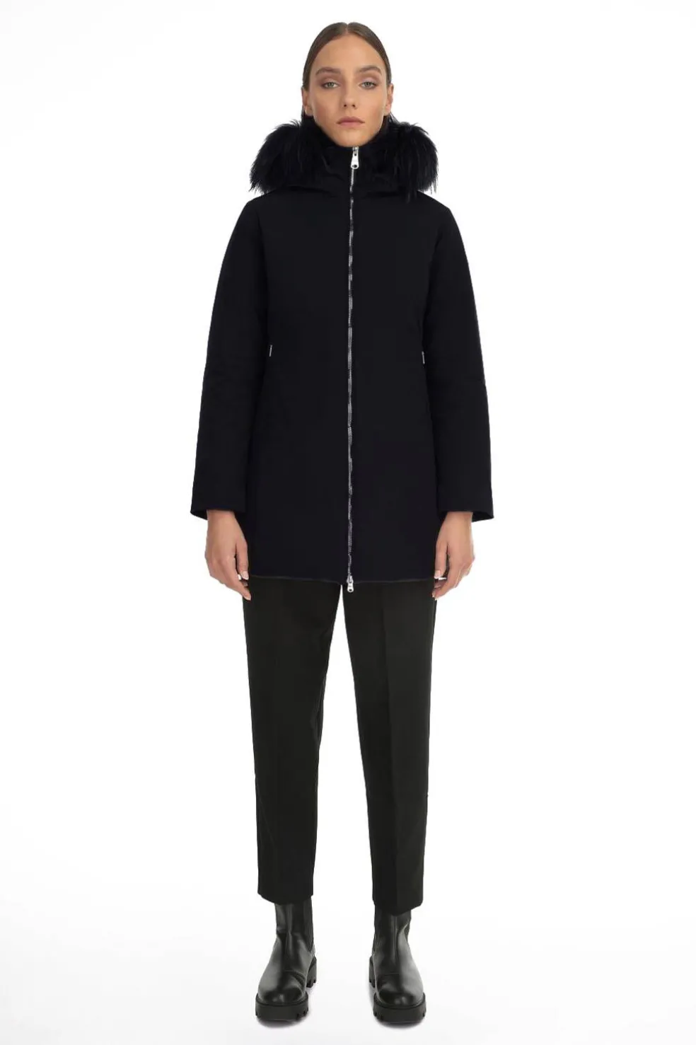 - capucha fija con ribete de piel de mapache desmontable
