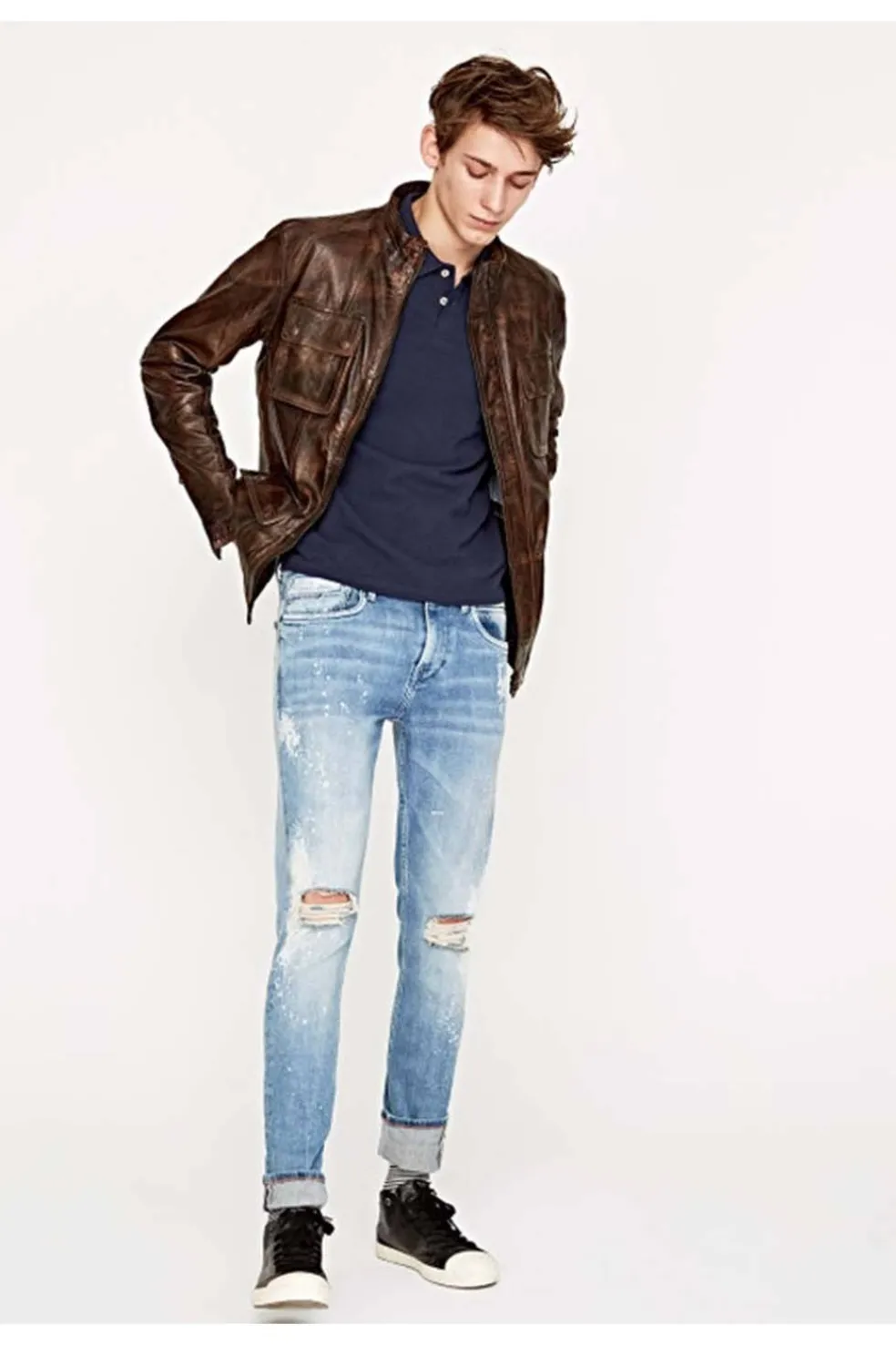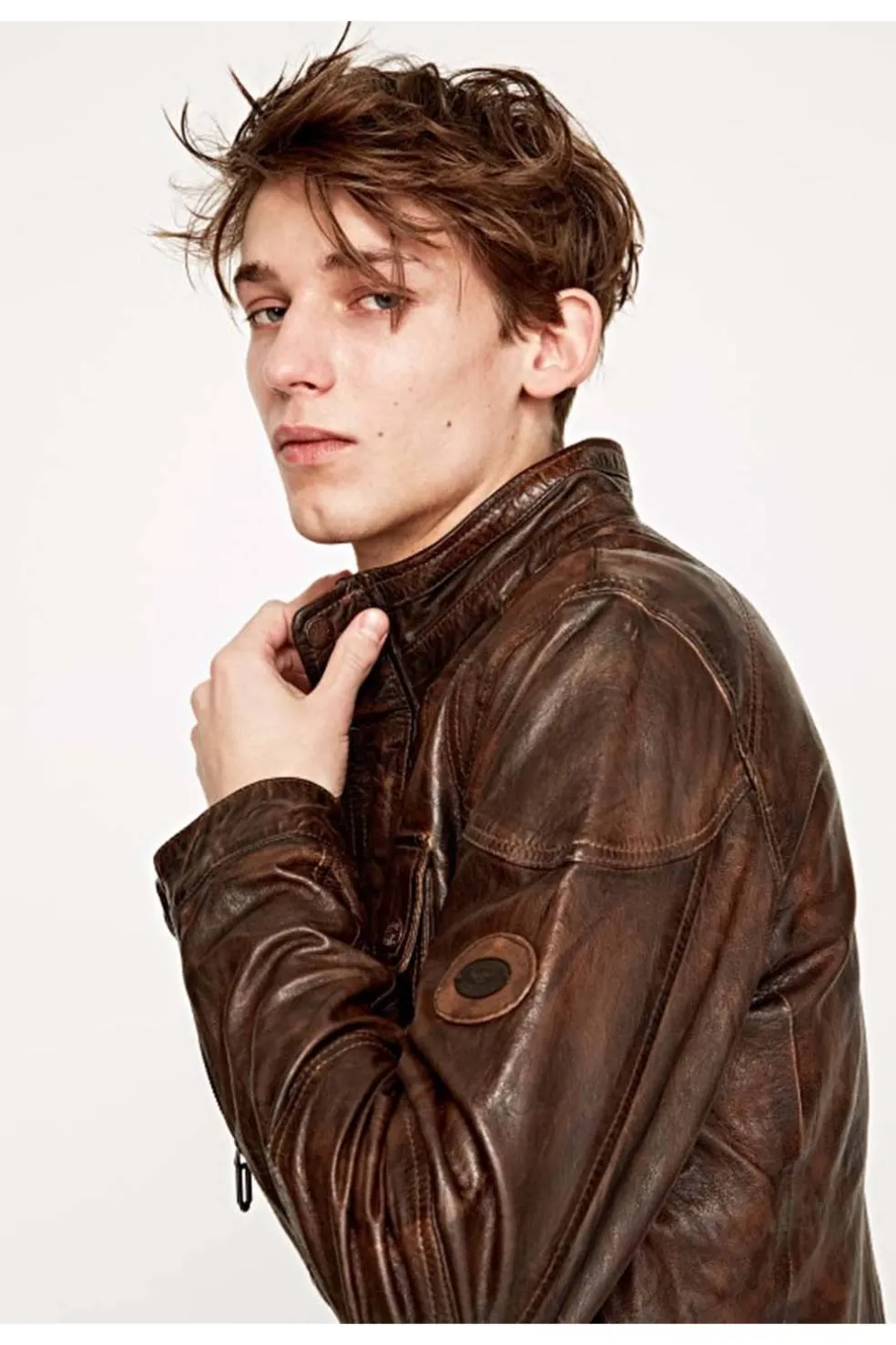 Cazadora de piel estilo aviador con efecto encerado. Multibolsillos.