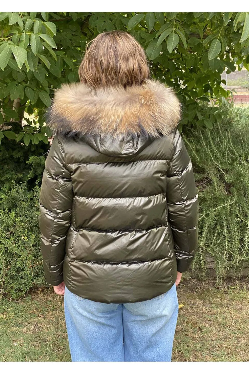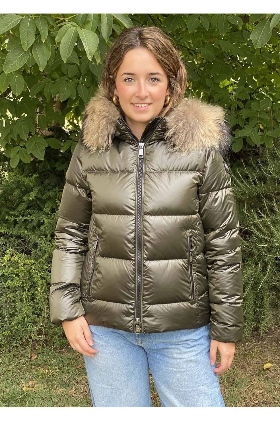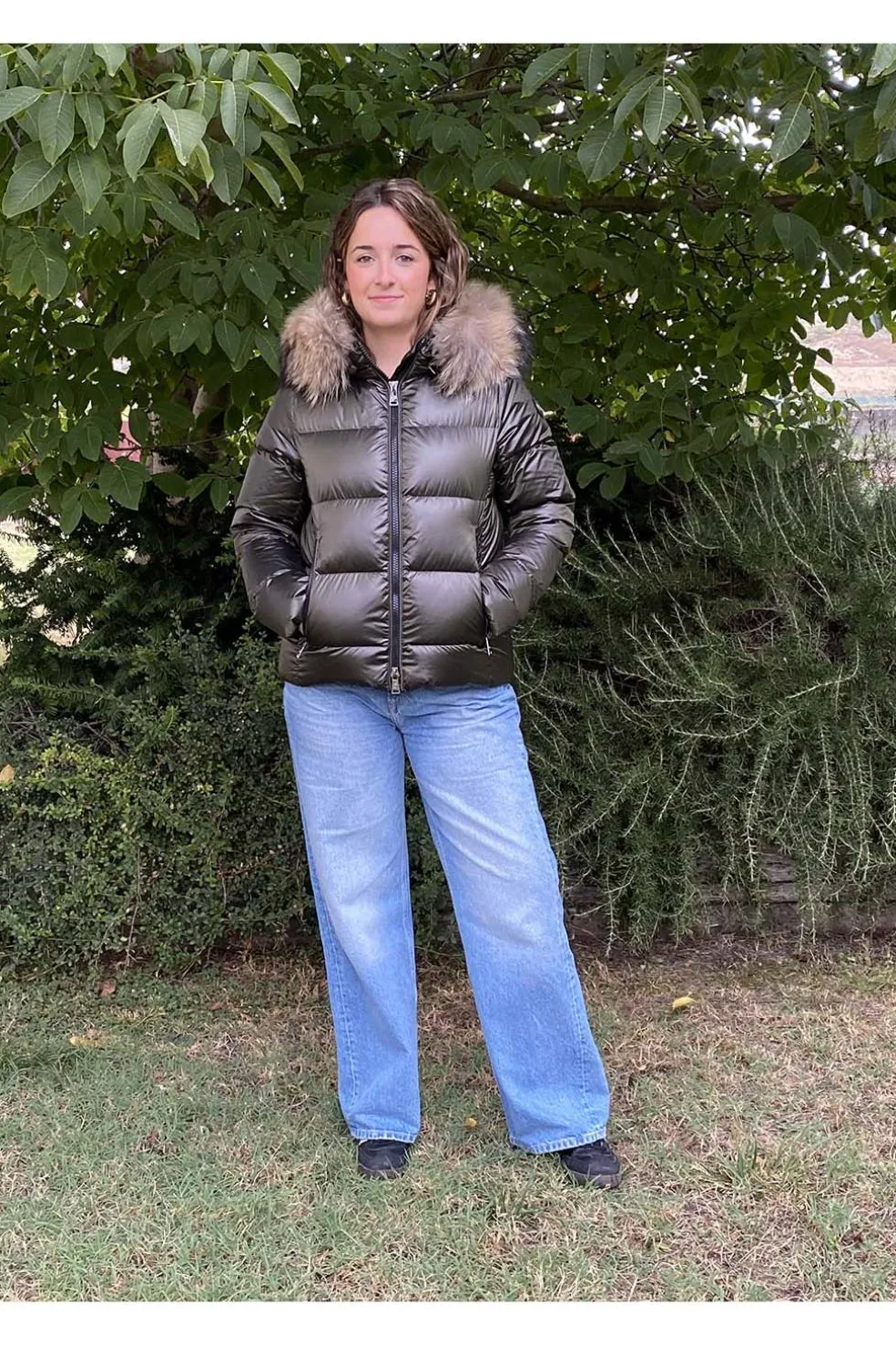 Plumífero corto de mujer con capucha desmontable con pelo natural desmontable.