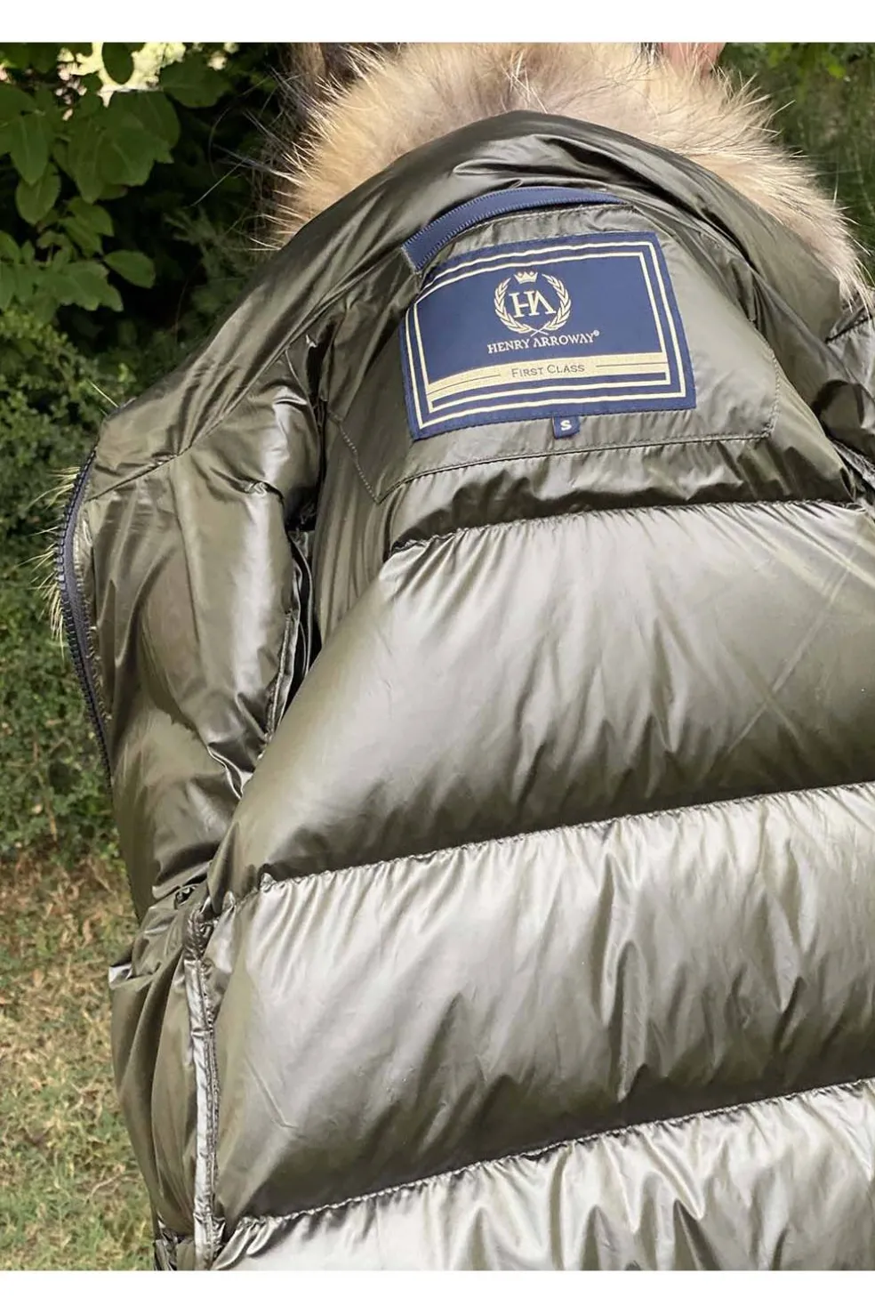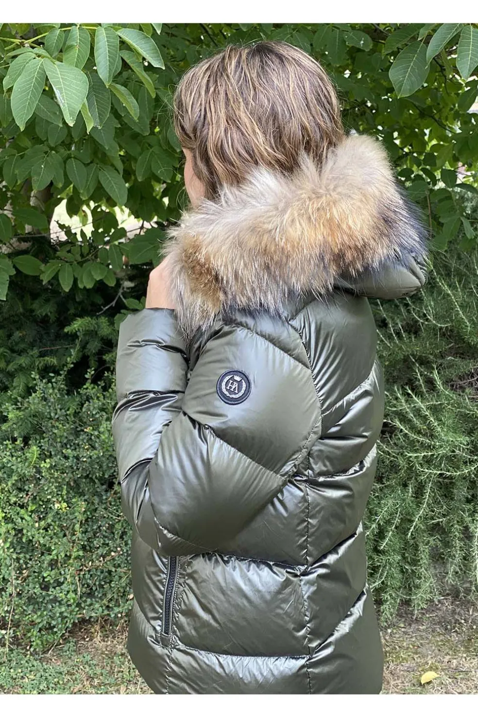 Plumífero corto de mujer. Cierre central con cremallera personalizada de doble carro. Bolsillos con cremalleras personalizadas. Capucha desmontable con pelo natural desmontable y tiradores. Repelente al agua y cortavientos. Relleno de plumón termorregulador.