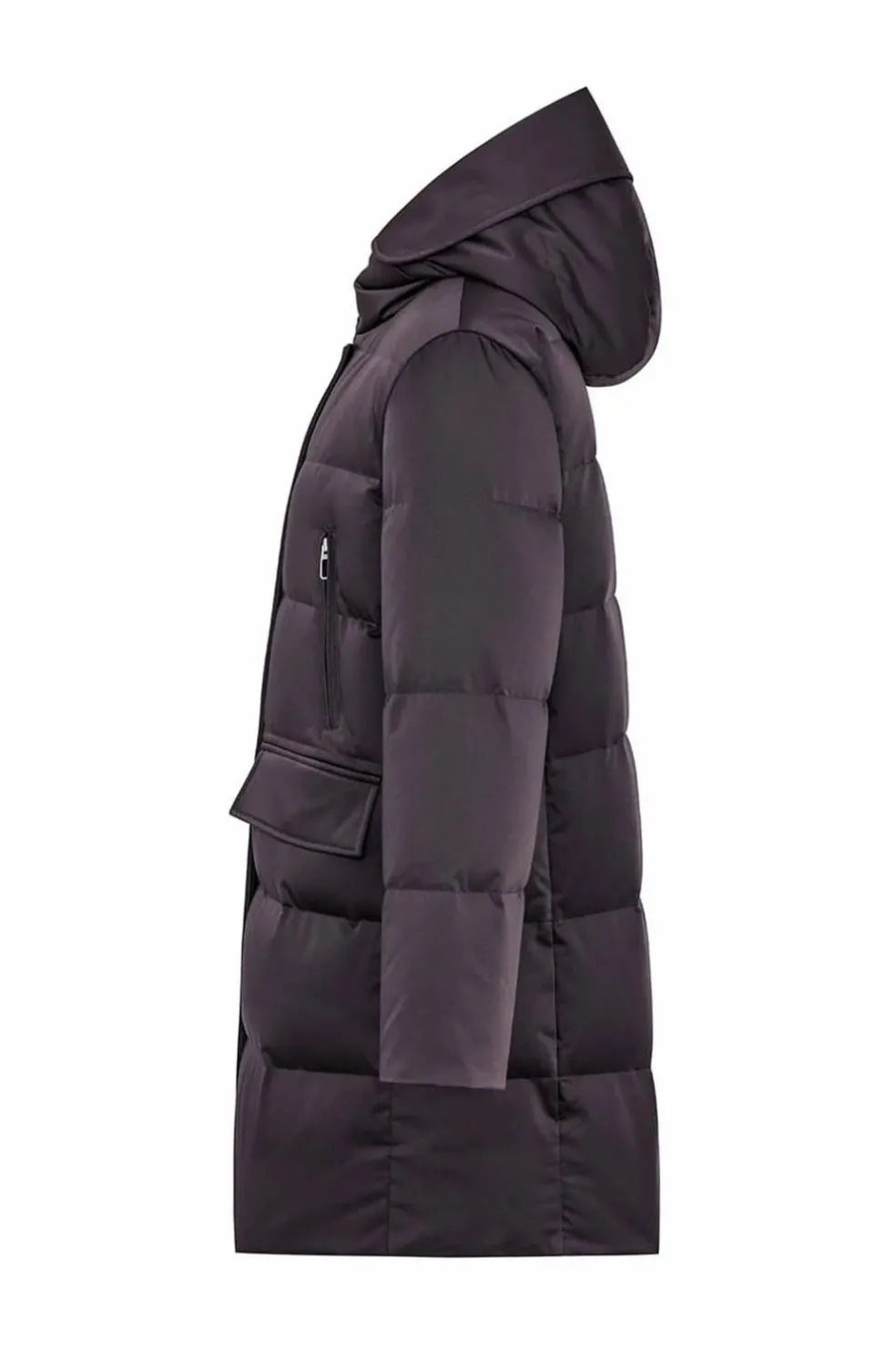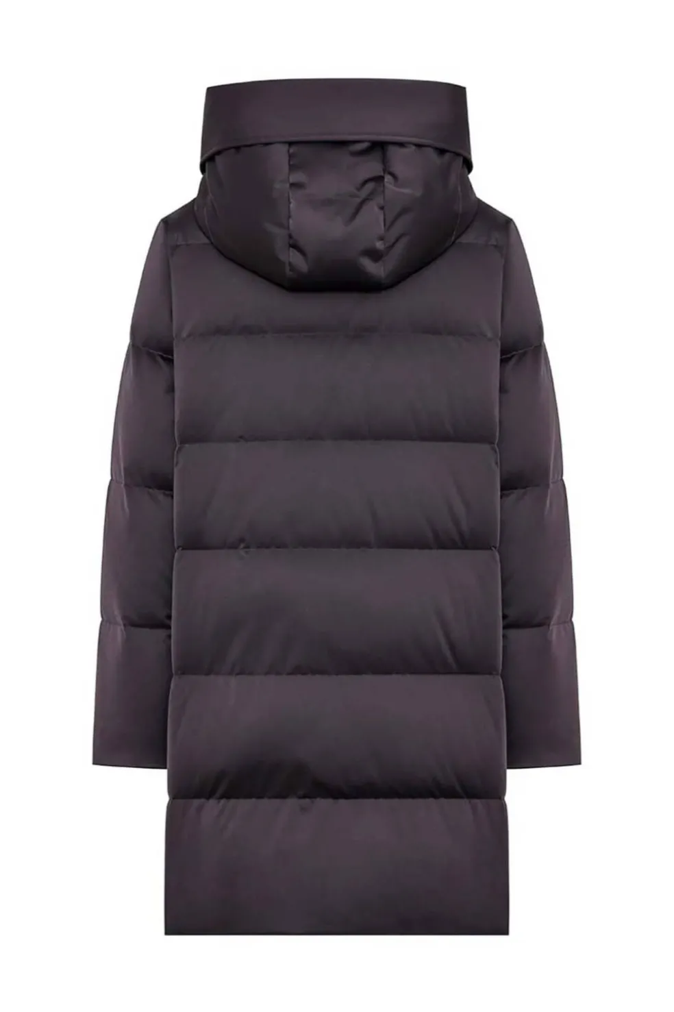 Plumífero técnico de satén con cuello alto, capucha con visera plegable y cordón ajustable en la espalda.