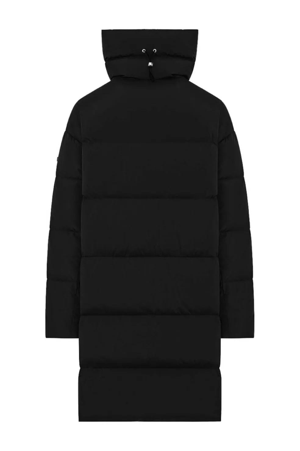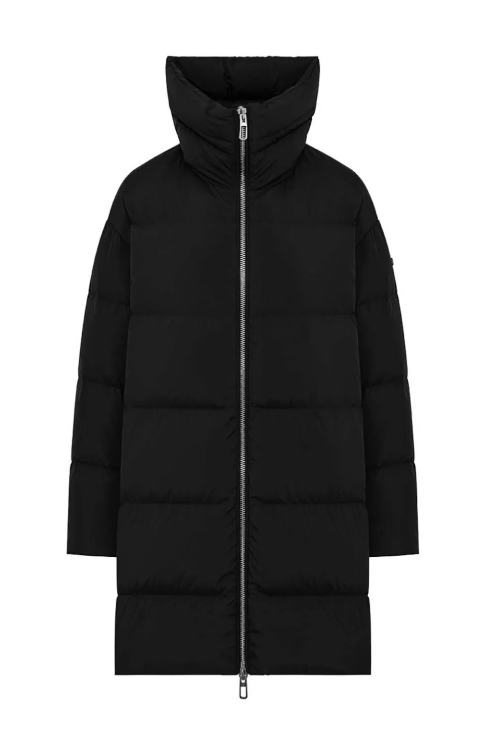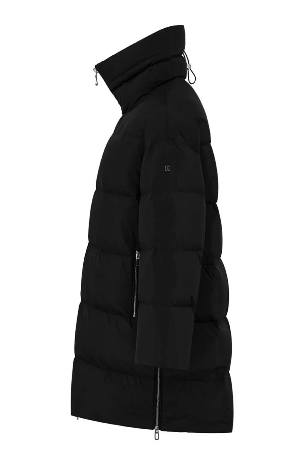 Chaqueta larga de plumón de microfibra ligera, con cuello alto y cordón exterior, cierre frontal con cremallera completa de doble cursor y aberturas laterales ajustables con cremallera.
