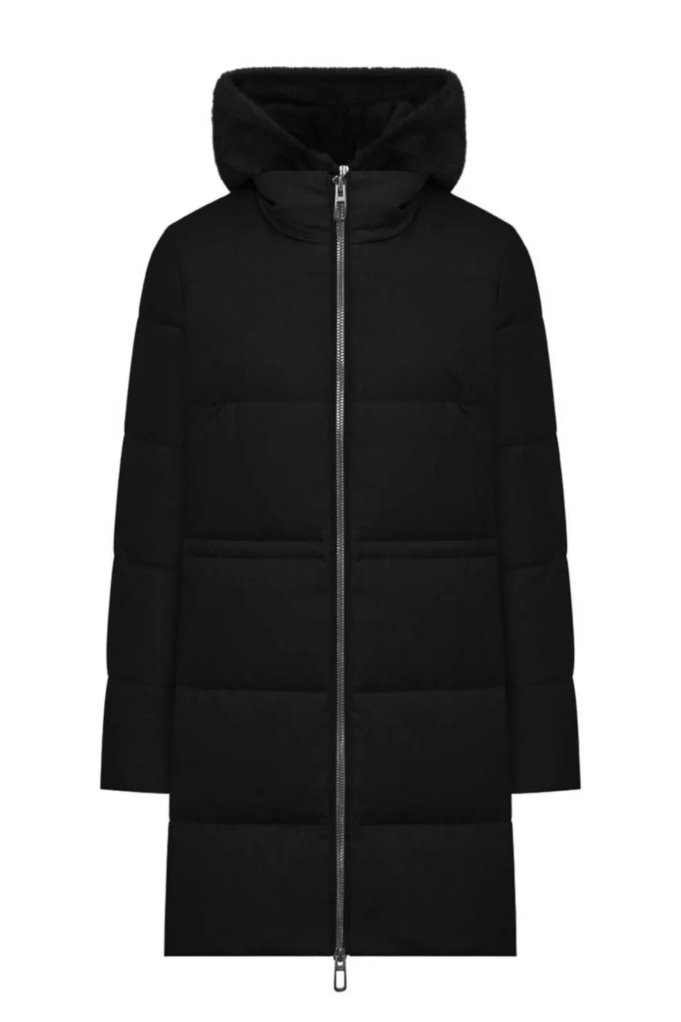 Plumífero acolchado de lana técnica con cuello alto ancho de tejido técnico con estructura de satén ajustable con cordón, bolsillos de ribete y cierre frontal con cremallera metálica de doble cursor y tirador. Cordón en el bajo para ajustar el ajuste de la prenda y puños de satén técnico.