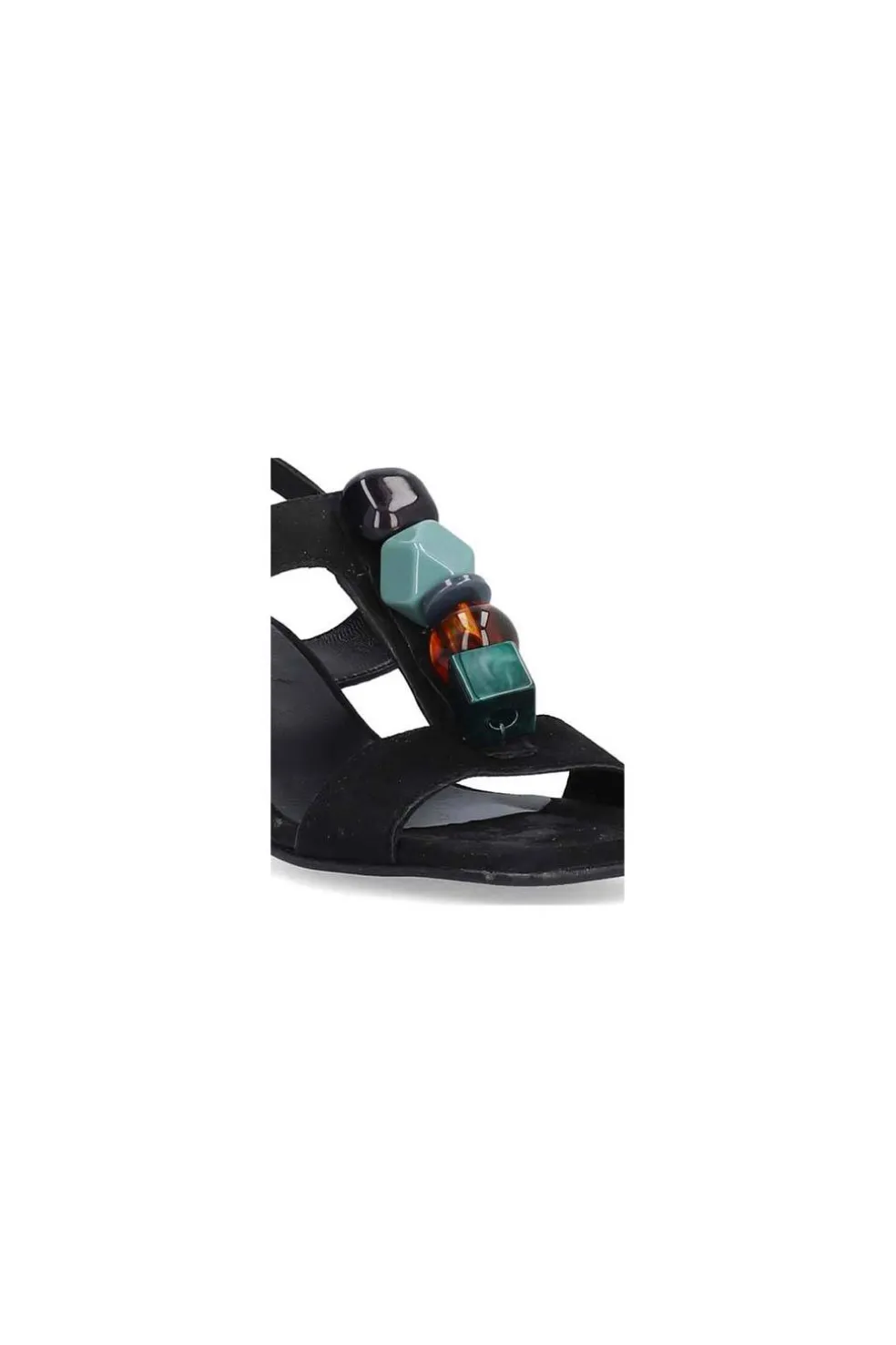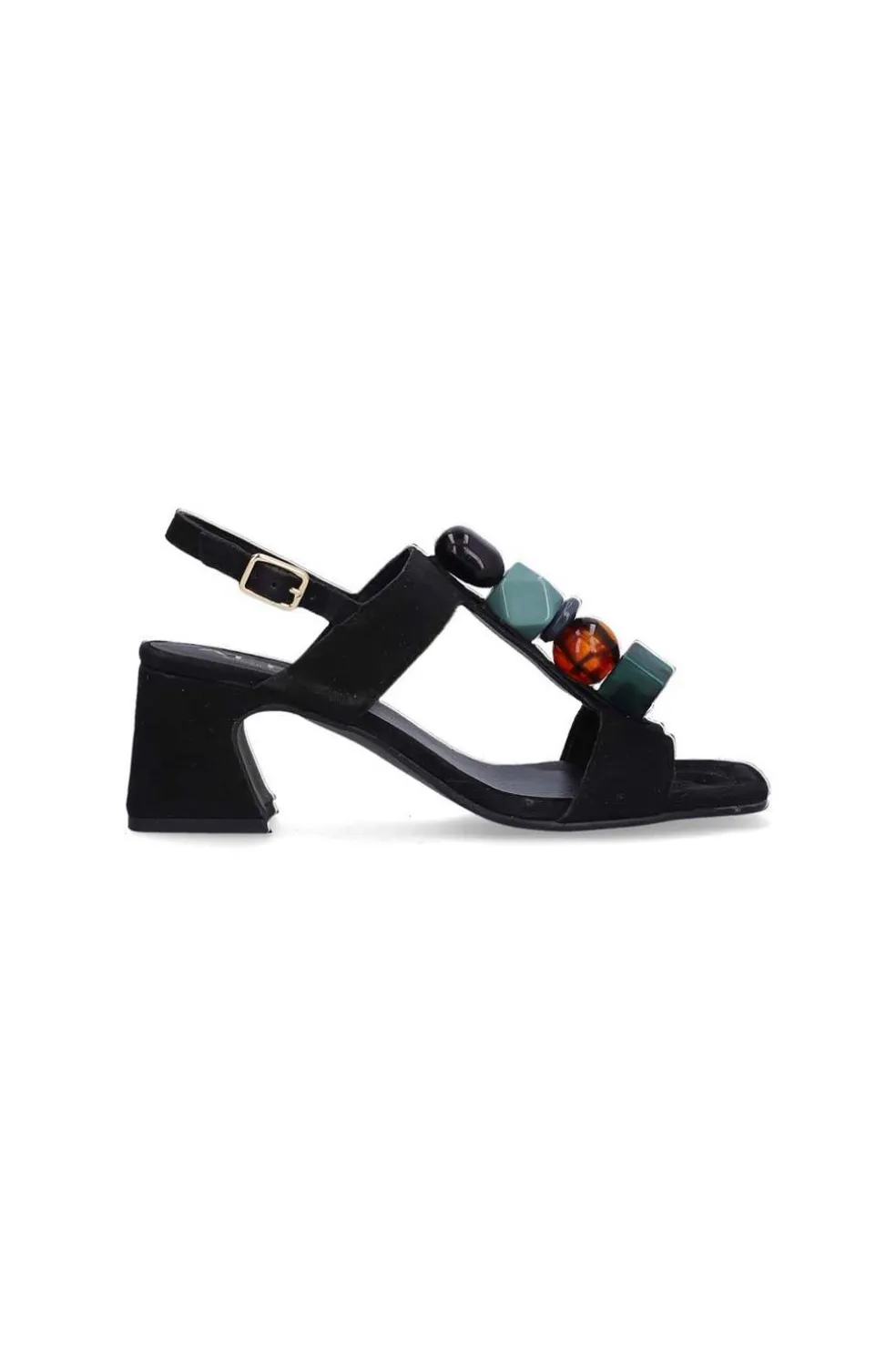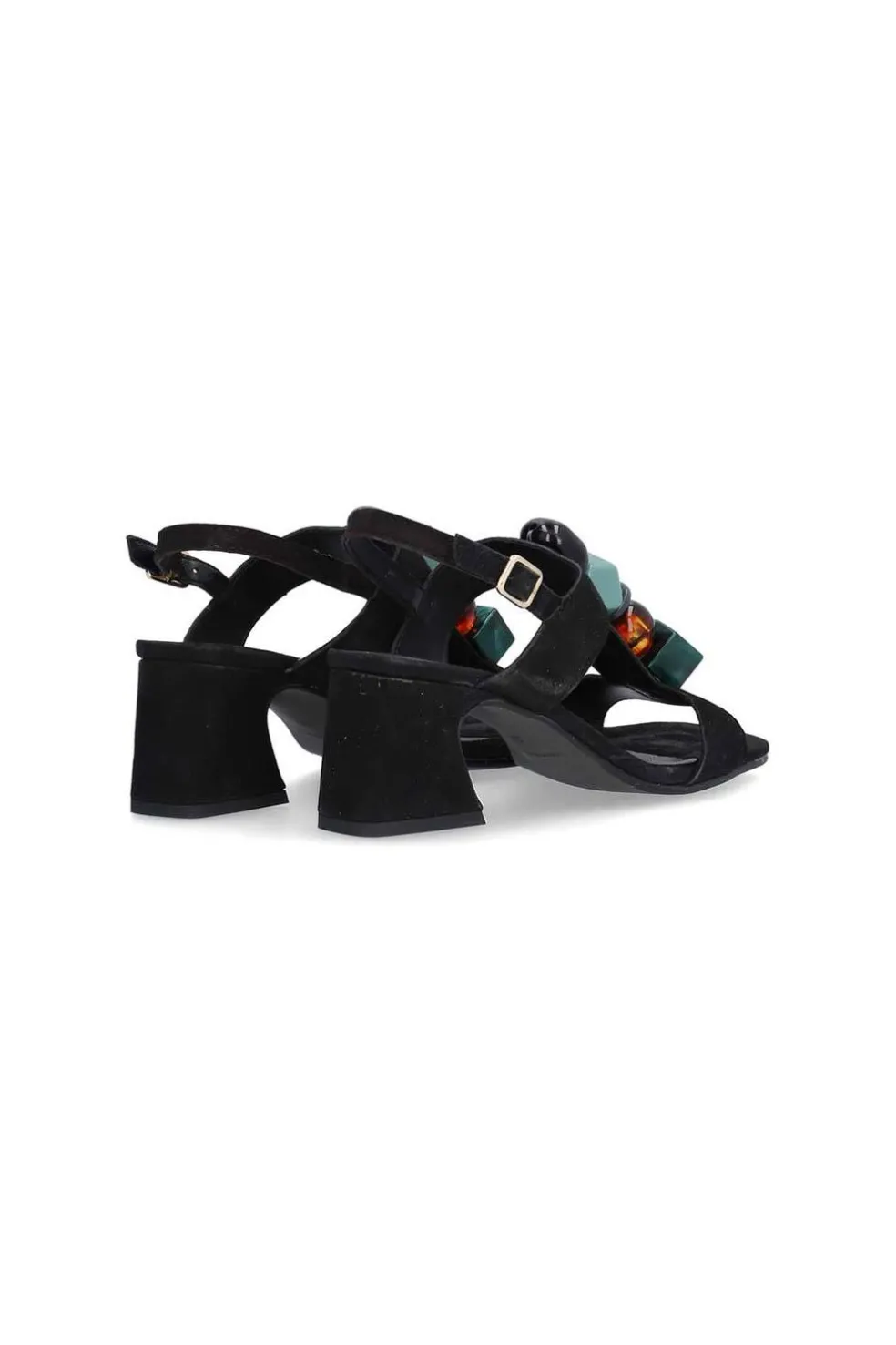Sandalia para mujer ALPE de color negro con tacón de 6,5 cm, suela antideslizante y puntera cuadrada, con cierre mediante hebilla.