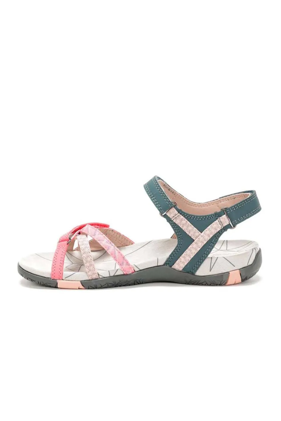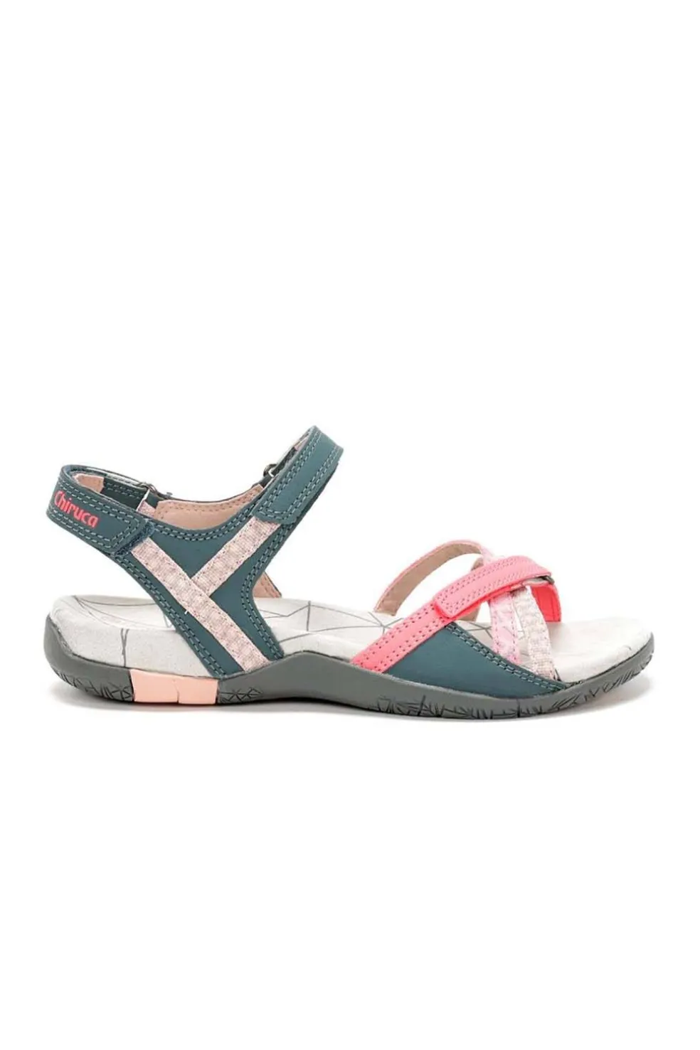 Corte sintético y textil. Cierre velcro. Entresuela EVA forrada de microfibra. Suela de goma. Peso 173 g.