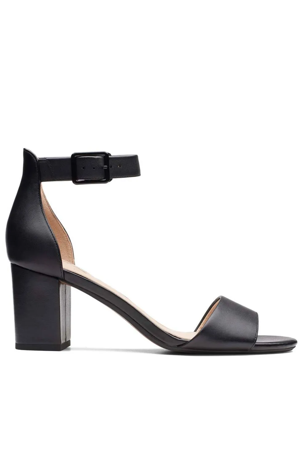 Sandalias de mujer en cuero negro con tacón ancho presentan una tira en el tobillo con un cierre de hebilla para proporcionar un ajuste seguro.