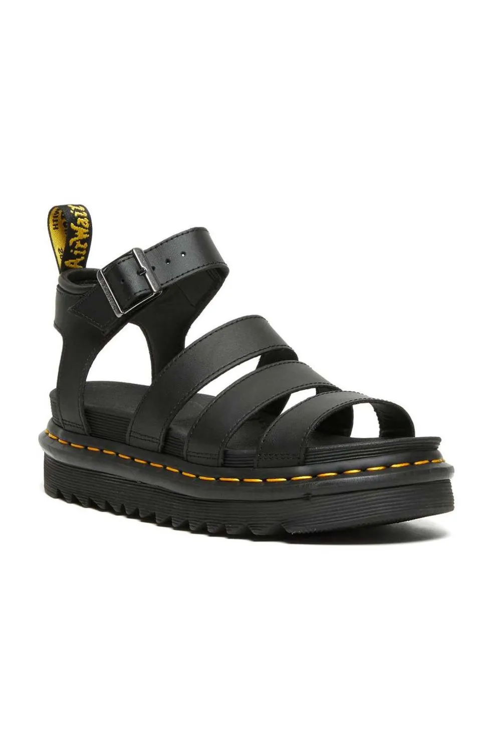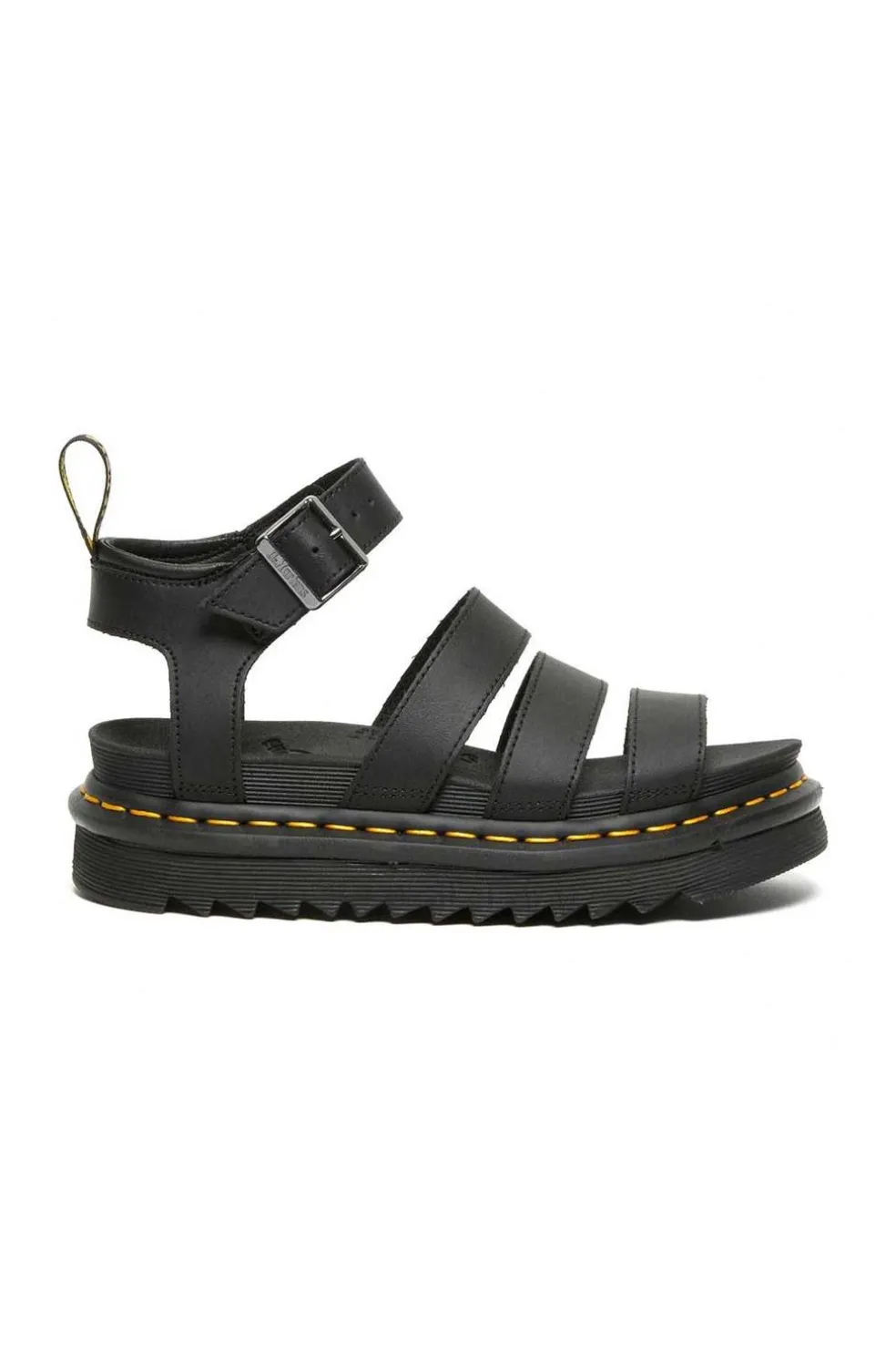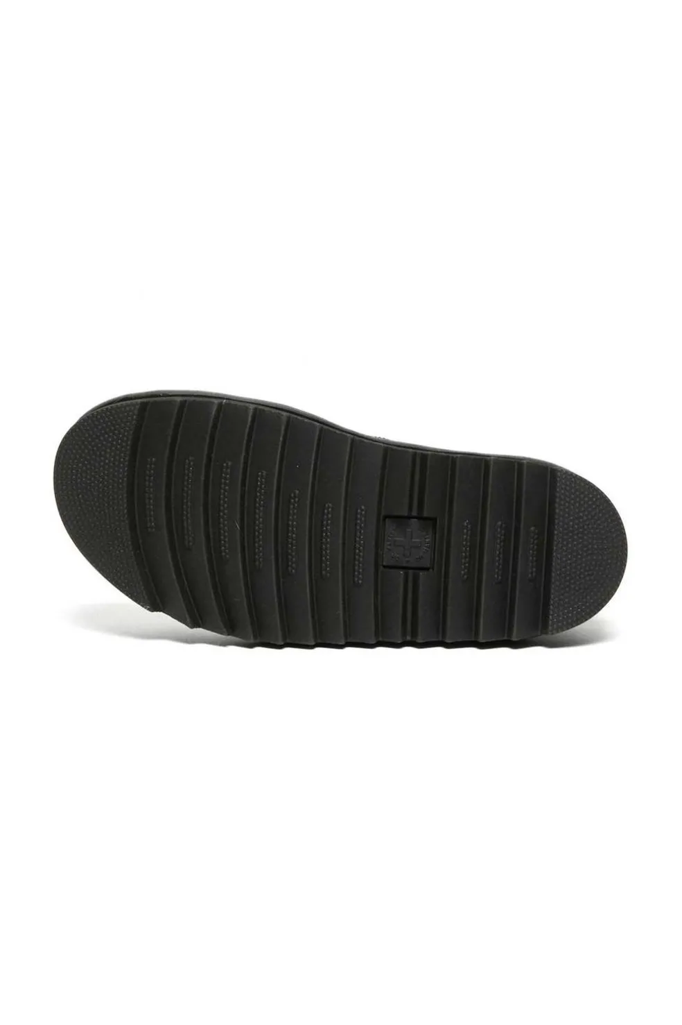 Sandalia Dr. Martens de piel untada con Poliuretano, de acabado mate y muy suave al tacto. Fabricada con empalmillado Goodyear. Cuenta con 5 cm de plataforma.