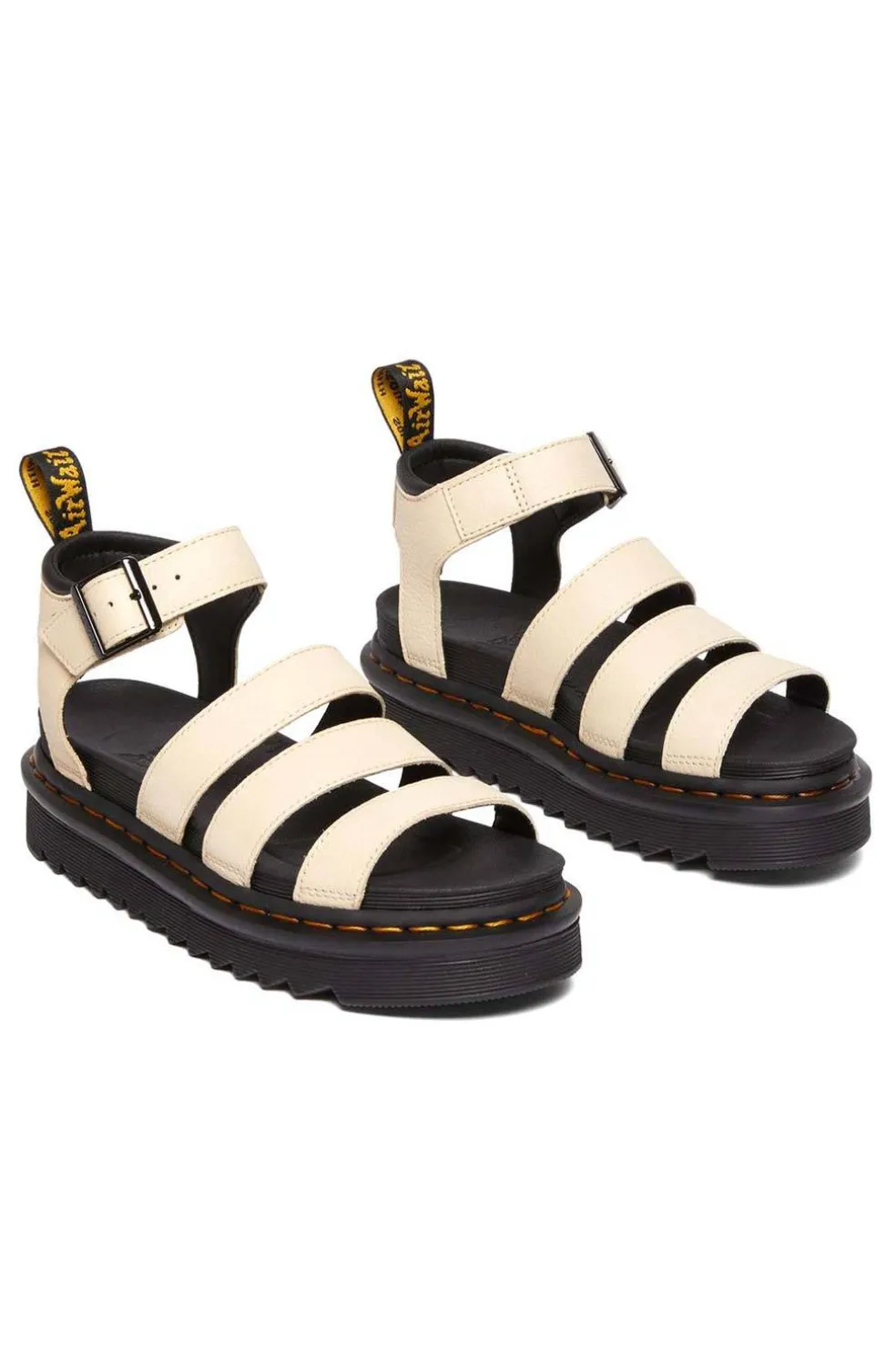 Sandalia Dr. Martens de piel untada con Poliuretano, de acabado mate y muy suave al tacto. Fabricada con empalmillado Goodyear. Cuenta con 5 cm de plataforma.