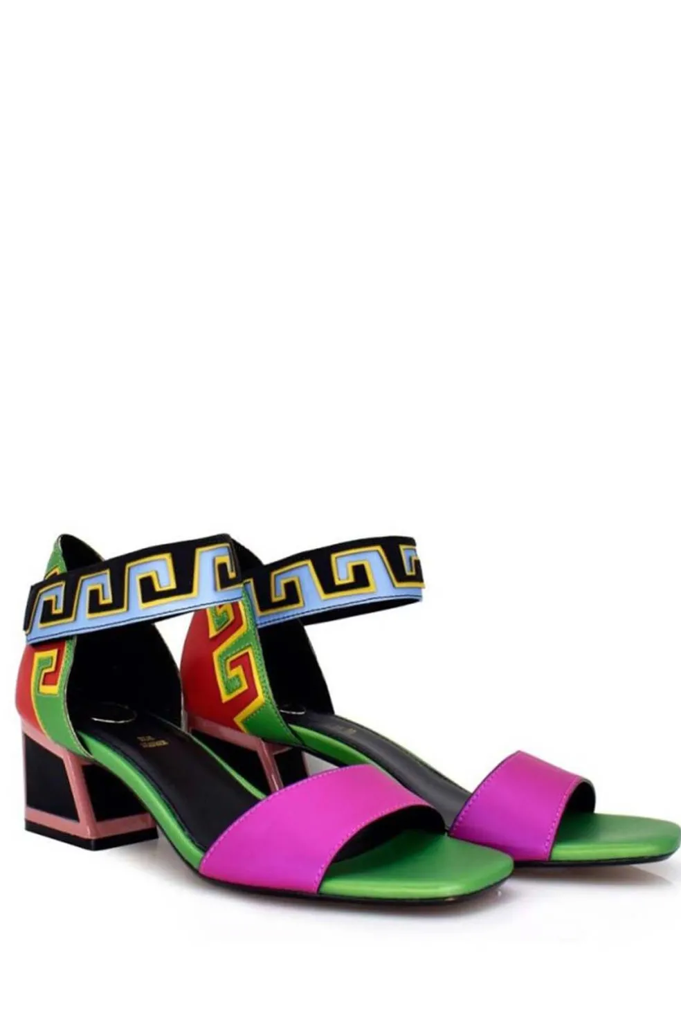 Sandalia tobillera multicolor con tacón geométrico de 5.5 cm de altura. Detalles geométricos. Cierre con velcro.