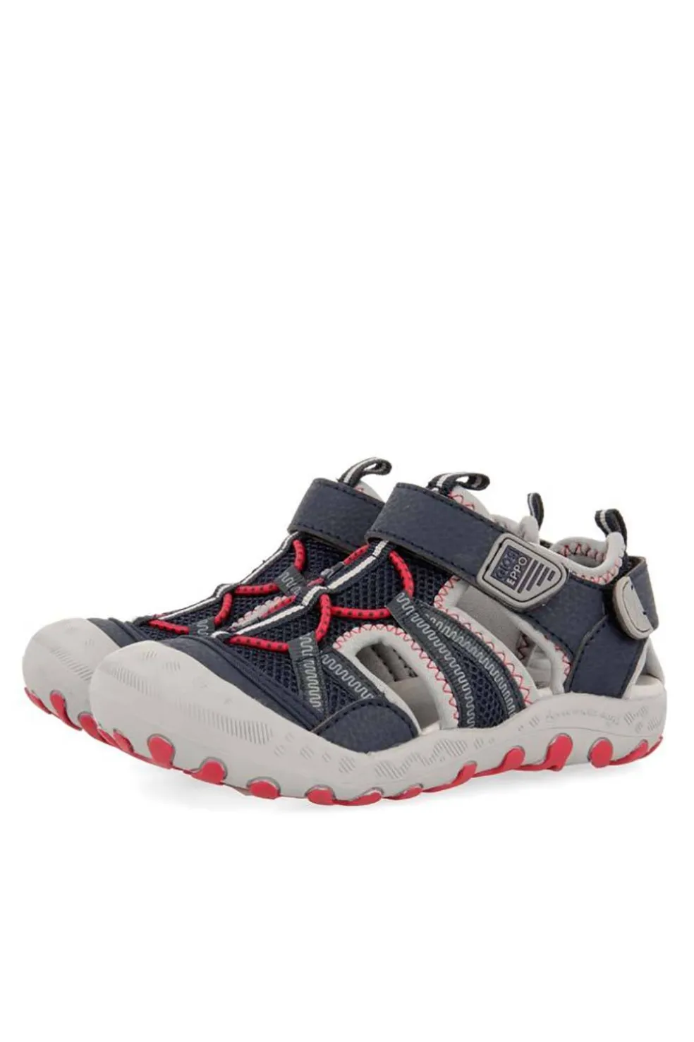 Chanclas deportivas azul marino con detalles rojos. Cierre de velcro al tobillo. Puntera reforzada.