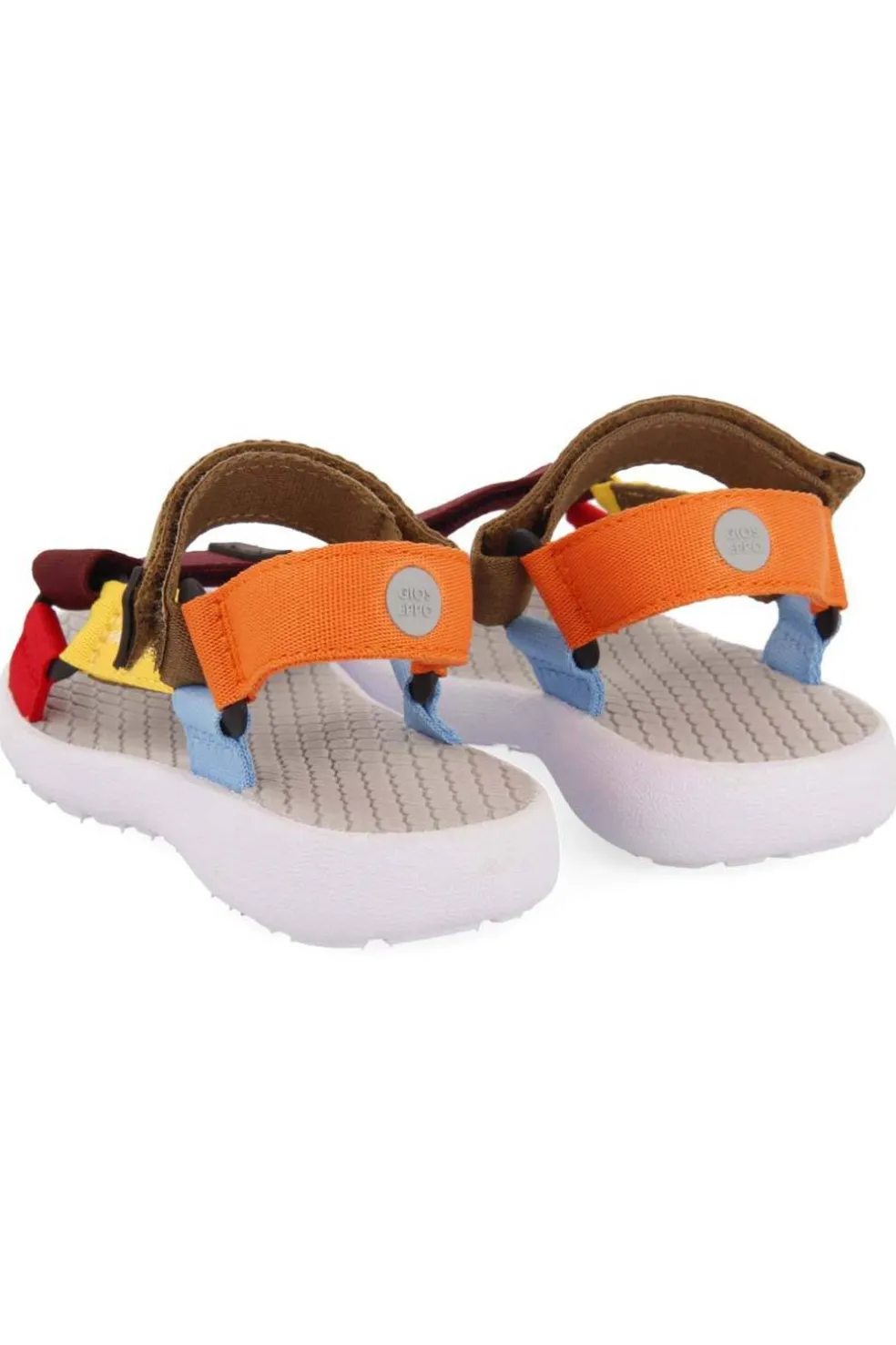 Sandalias multicolor con suela de aspecto deportivo blanca con la planta en azul. El corte es de tiras de nailon en variedad de tonos. La suela de EVA ligera y la plantilla acolchada muy suave. El forro y la plantilla son de poliéster. Plantilla acolchada, Forro de poliéster, Plantilla de poliéster, Suela de EVA, Suela ligera