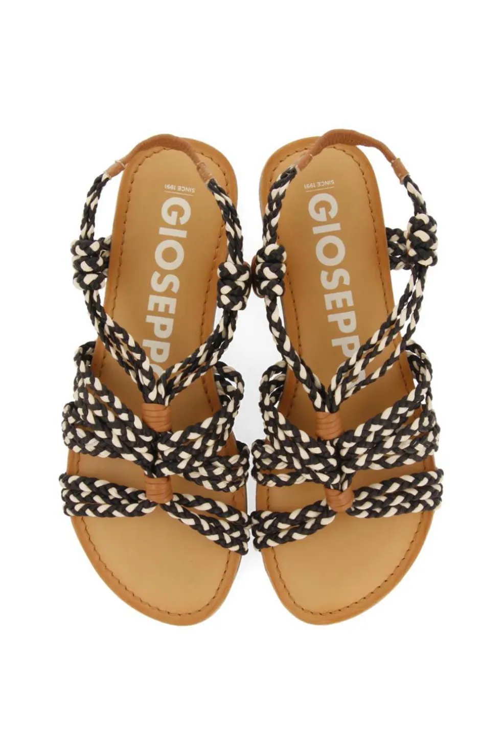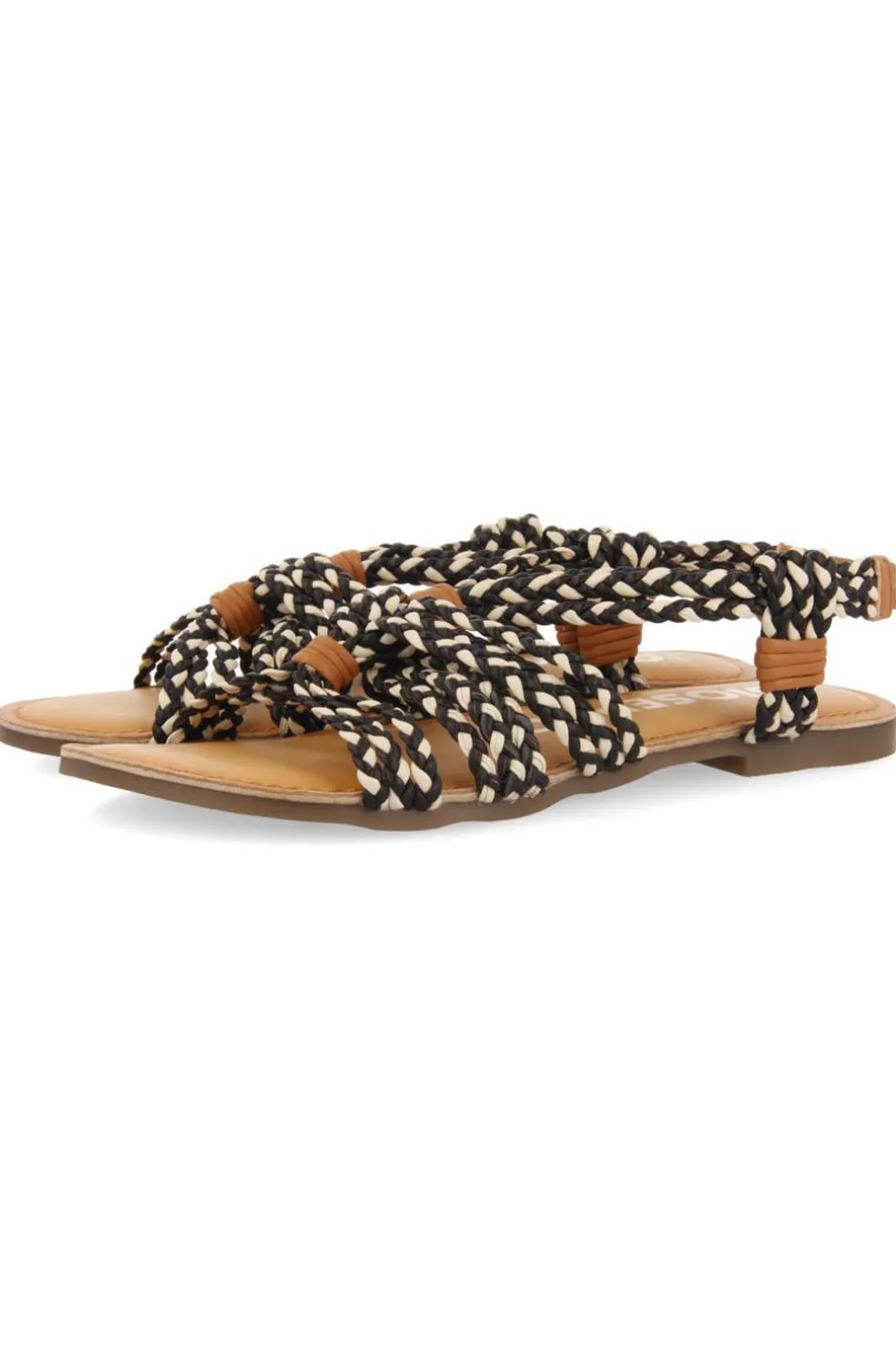 Sandalias planas con trenzado blanco y negro con cierre ajustable. Plantilla de piel acolchada de látex que asegura un mayor confort.