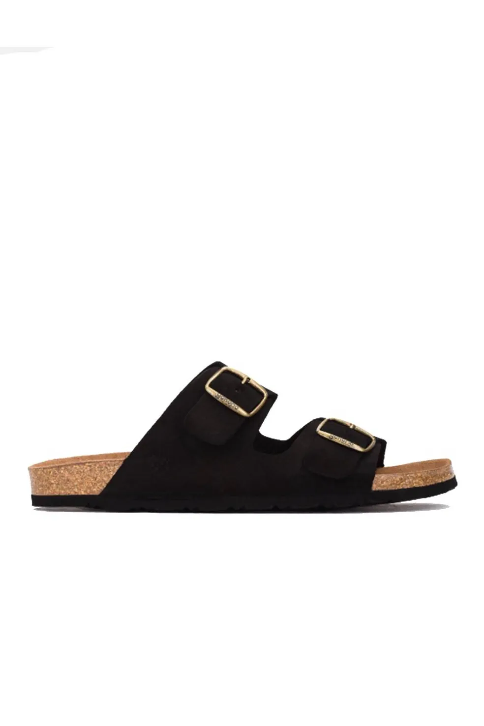 El clásico modelo MACAM 150 en negro, compuesto por dos tiras que cubren el empeine y dos llamativas hebillas grandes. Suela de 2 cm. Plantilla acolchada y antideslizante que garantiza el agarre y comodidad absoluta del pie.