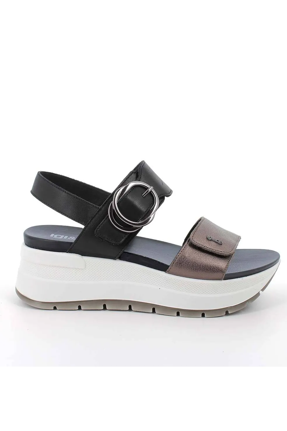 Sandalias de piel con líneas de diseño y estilo deportivo, adornadas con una banda con hebilla ornamental y ajuste con velcro.