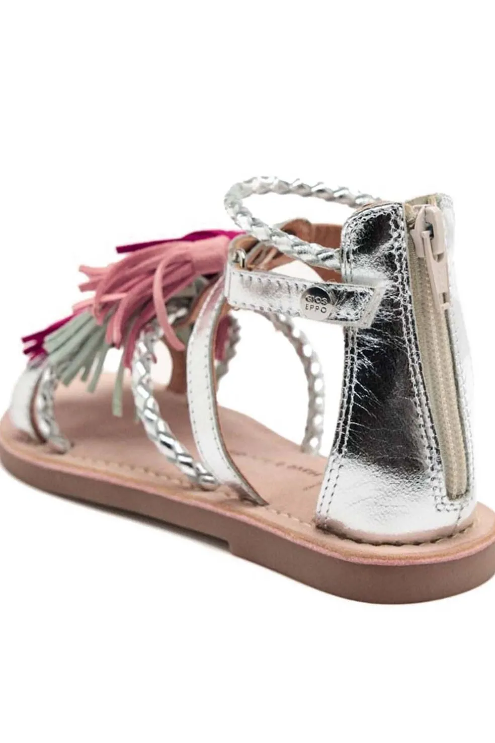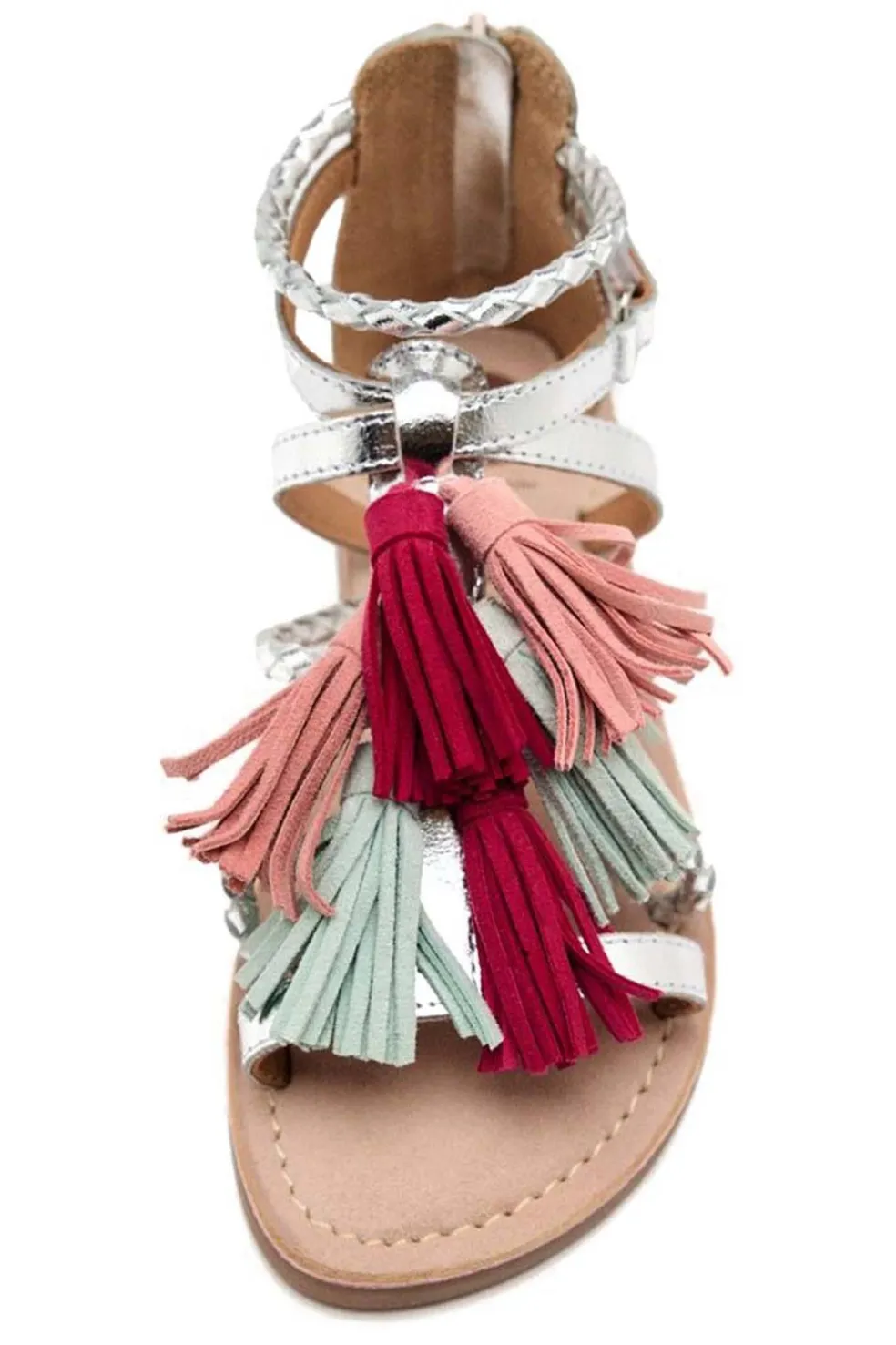 SANDALIAS FLECOS PIEL JANESVILLE. Sandalias de piel metalizada con adorno de flecos. Cuentan con planta de piel tipo serraje, suave y acolchada y cierre ajustable en el tobillo.