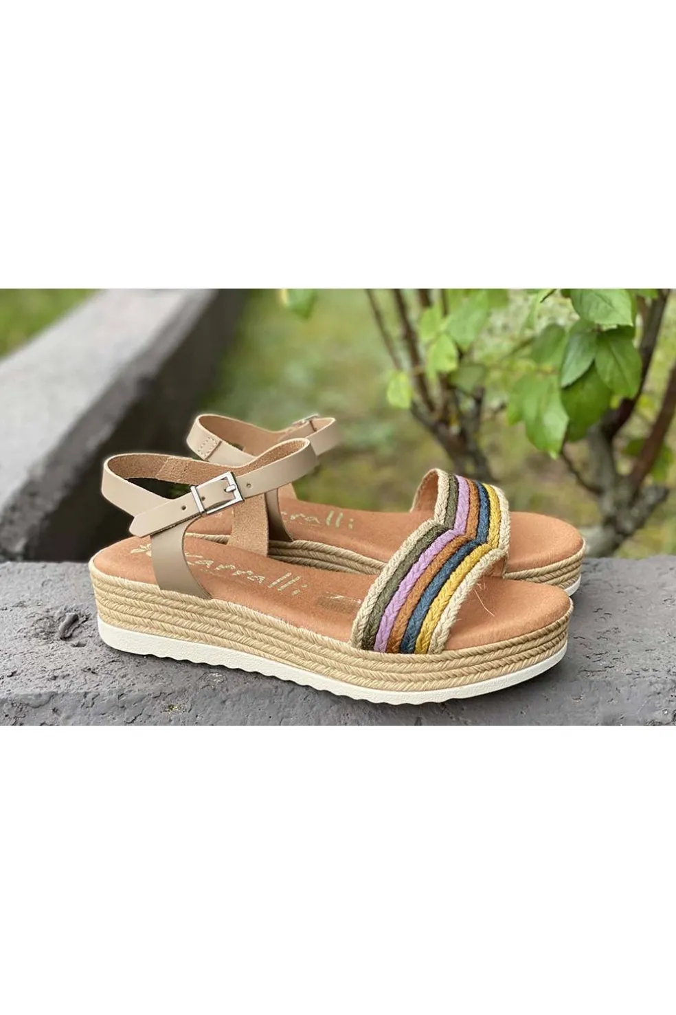 Sandalia Karralli en color beige con tira decorada con diferentes colores. Cuenta con una plantilla acolchada muy cómoda. Fabricada en España.