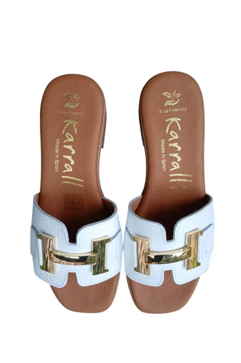 Sandalia Karralli de piel con detalle metálico dorado. Cuenta con una plantilla acolchada muy cómoda. Fabricada en España.