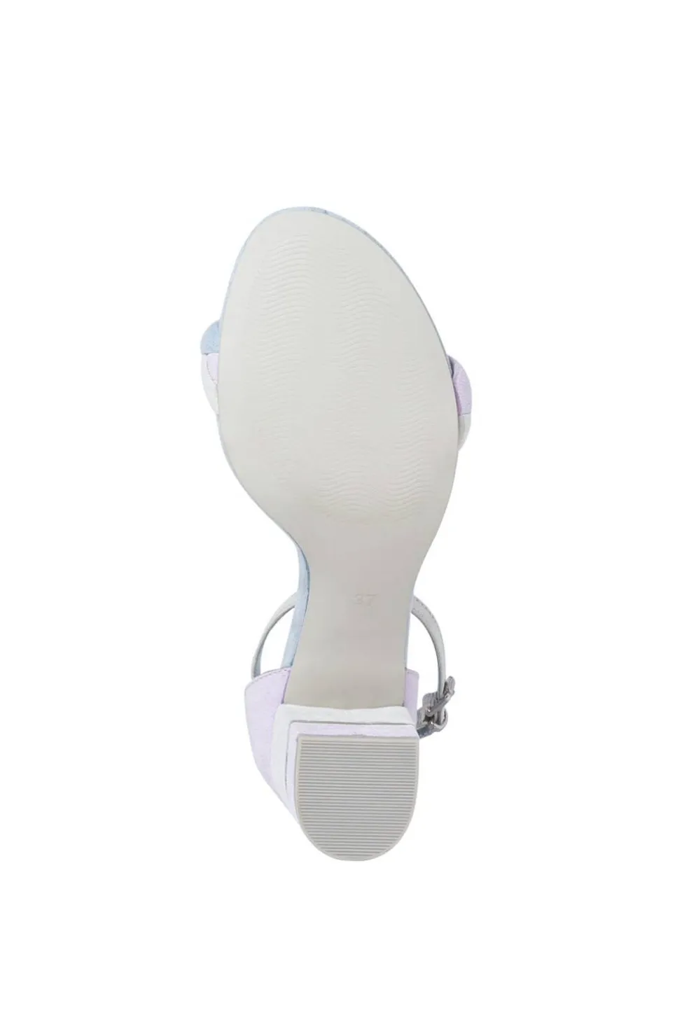 Sandalia Marco Tozzi con tacón de bloque de 7,5 cm. Está fabricada con materiales sintéticos y textiles. Cuenta con cierre de broche.