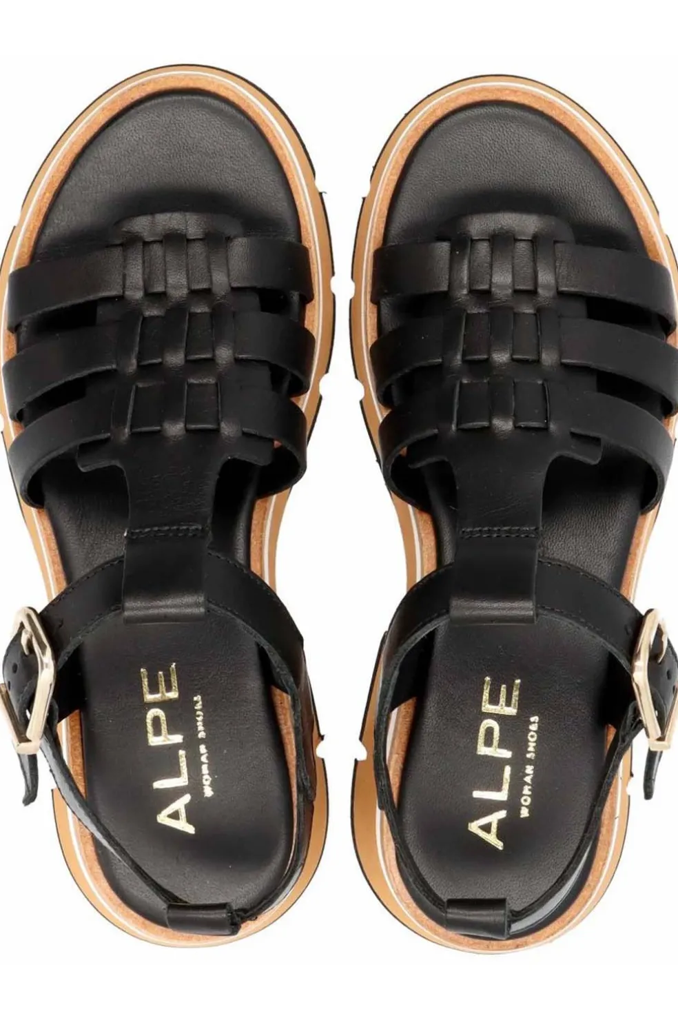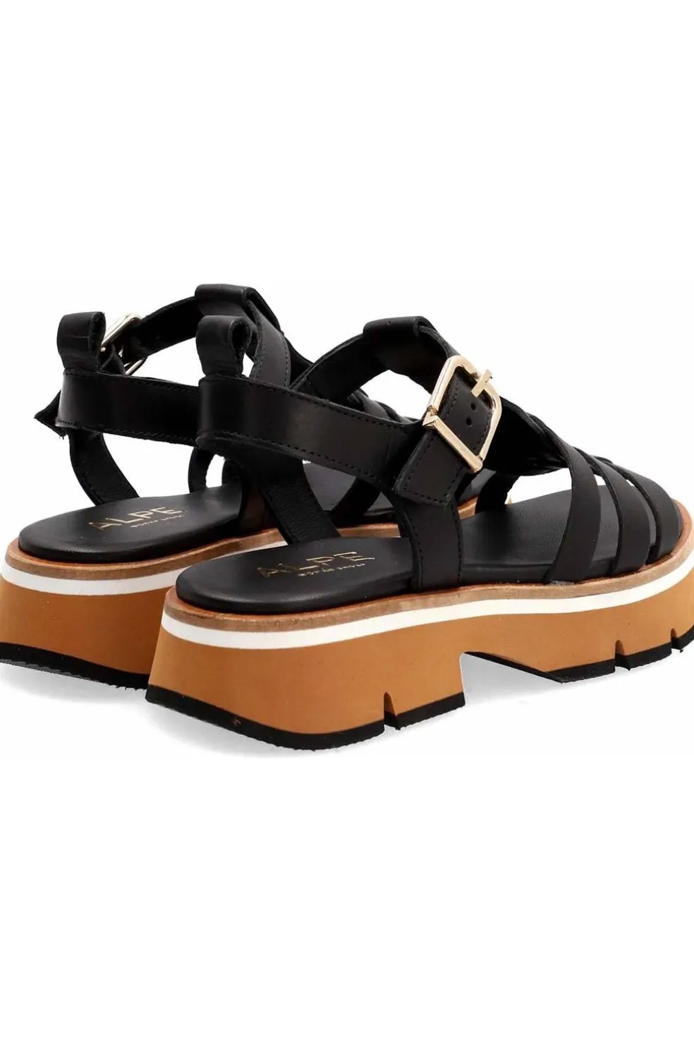 Sandalia para mujer ALPE ZANZIBAR fabricado en piel (ball lux) de color negro con plataforma de 4 cm, suela antideslizante y puntera redonda, con cierre mediante hebilla.