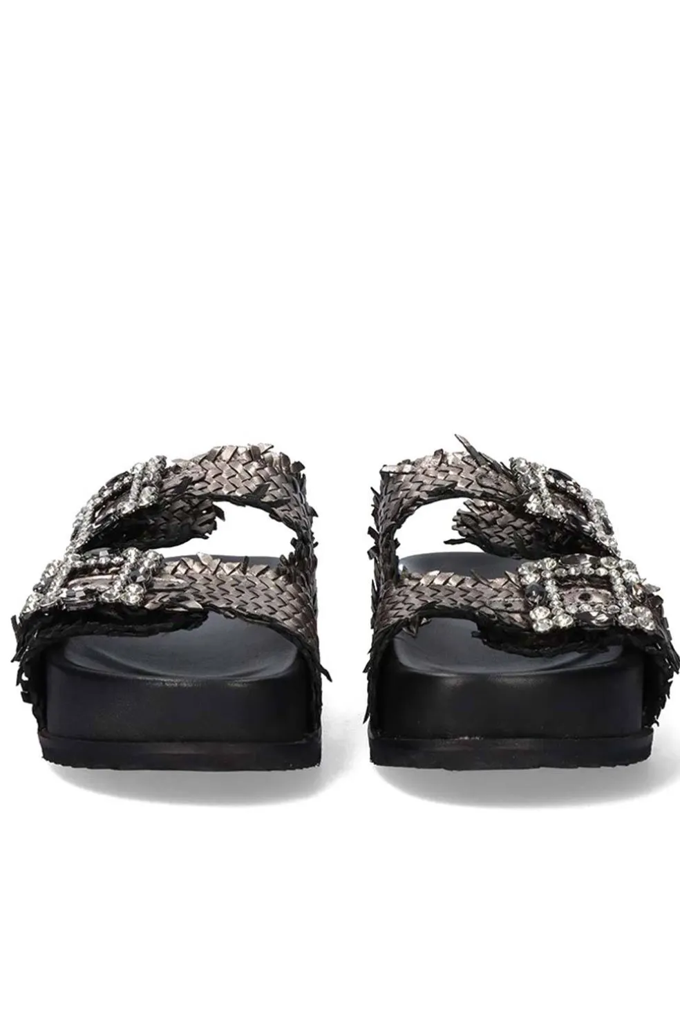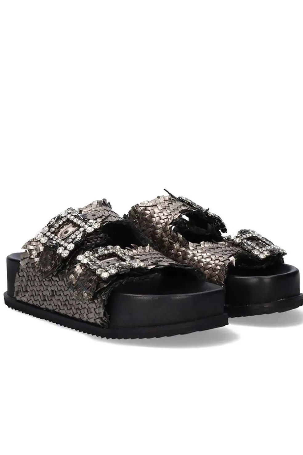 Las sandalias Mary, confeccionadas en lujosa piel, renuevan en clave refinada un modelo clásico de fondo de armario con hebillas de brillantes. El diseño de color pewter se completa con un toque contemporáneo dado por su plataforma interpretando un estilo rompedor, elegante y desenvuelto.