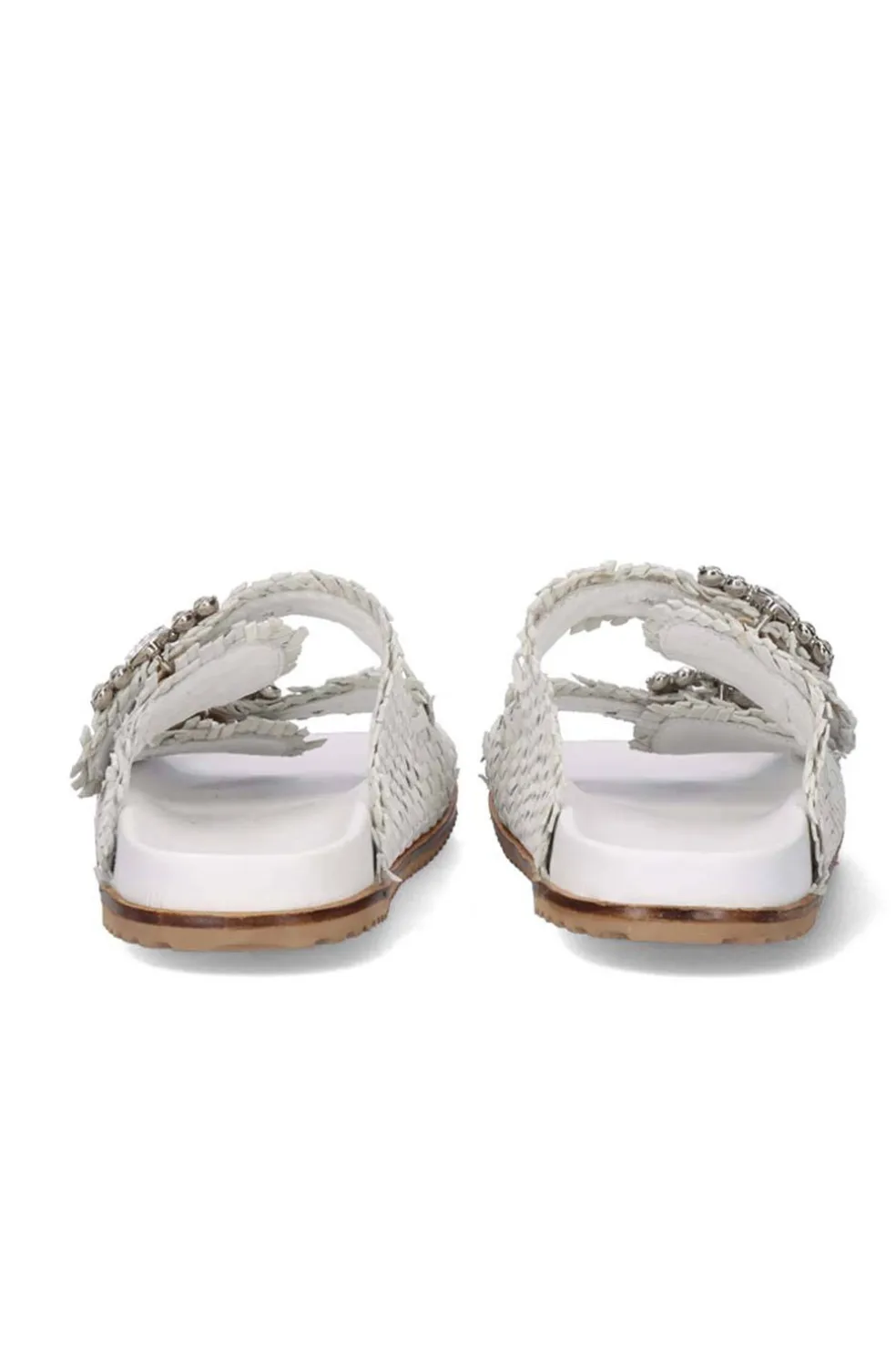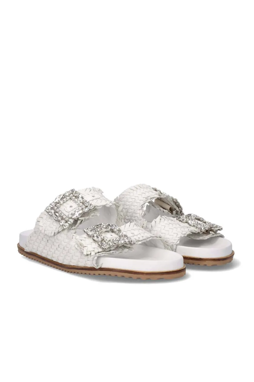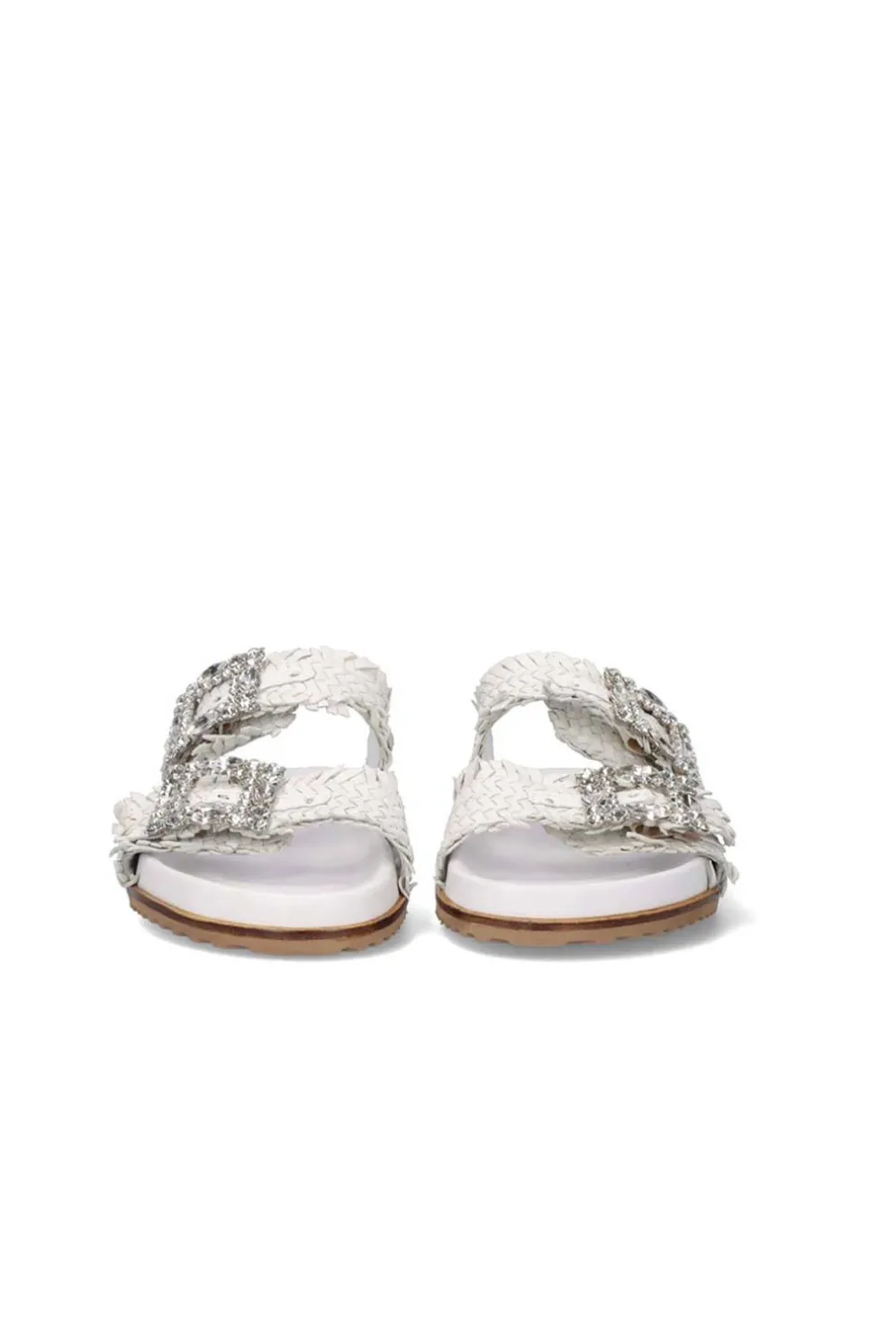 Sandalia plana en color blanco. Su corte y plantilla son de piel, la suela es de material sintético. Detalle dos tiras cruzadas con hebilla con cristales.