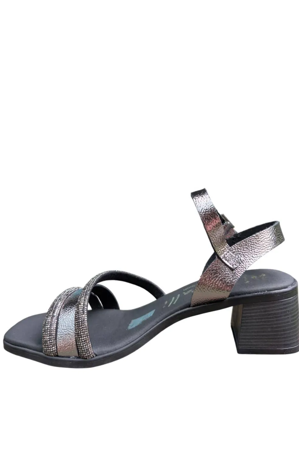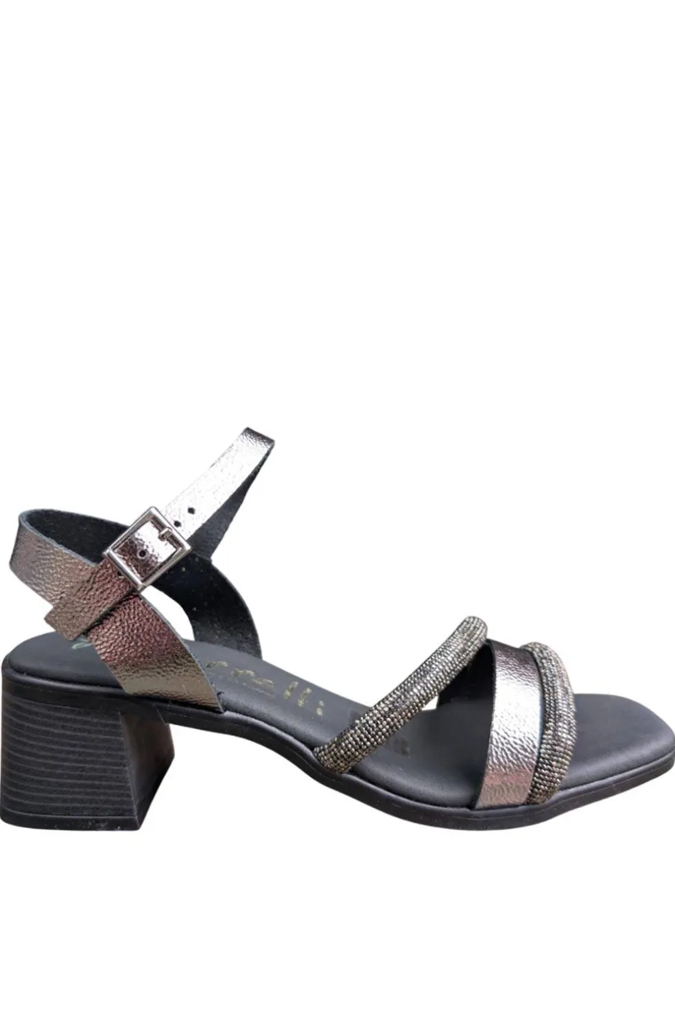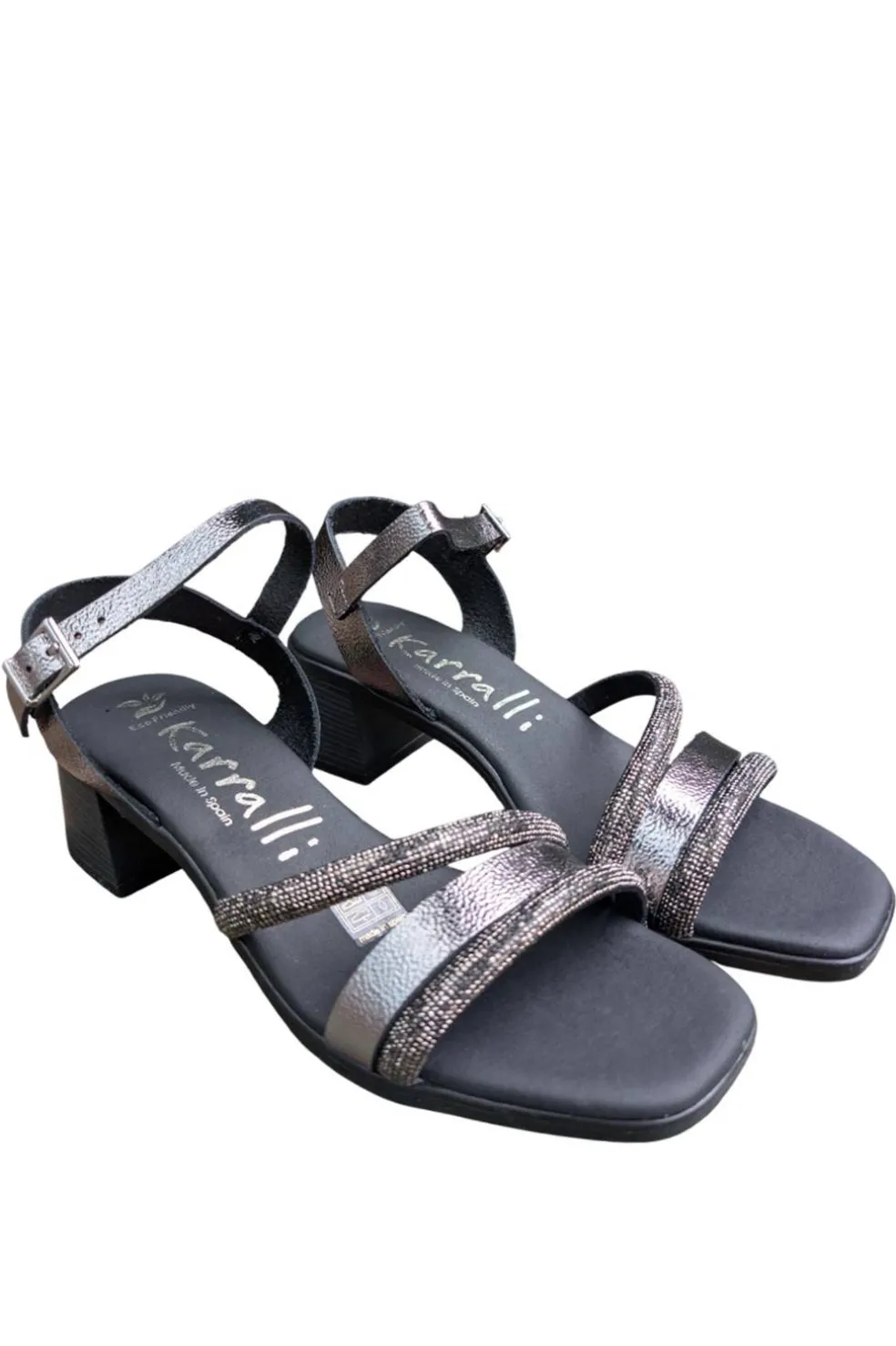 Sandalia de piel con tiras con brillantes y pulsera con hebilla. Planta acolchada. Muy ligeras. Tacón imitación madera de 5 cm y plataforma de 1 cm.