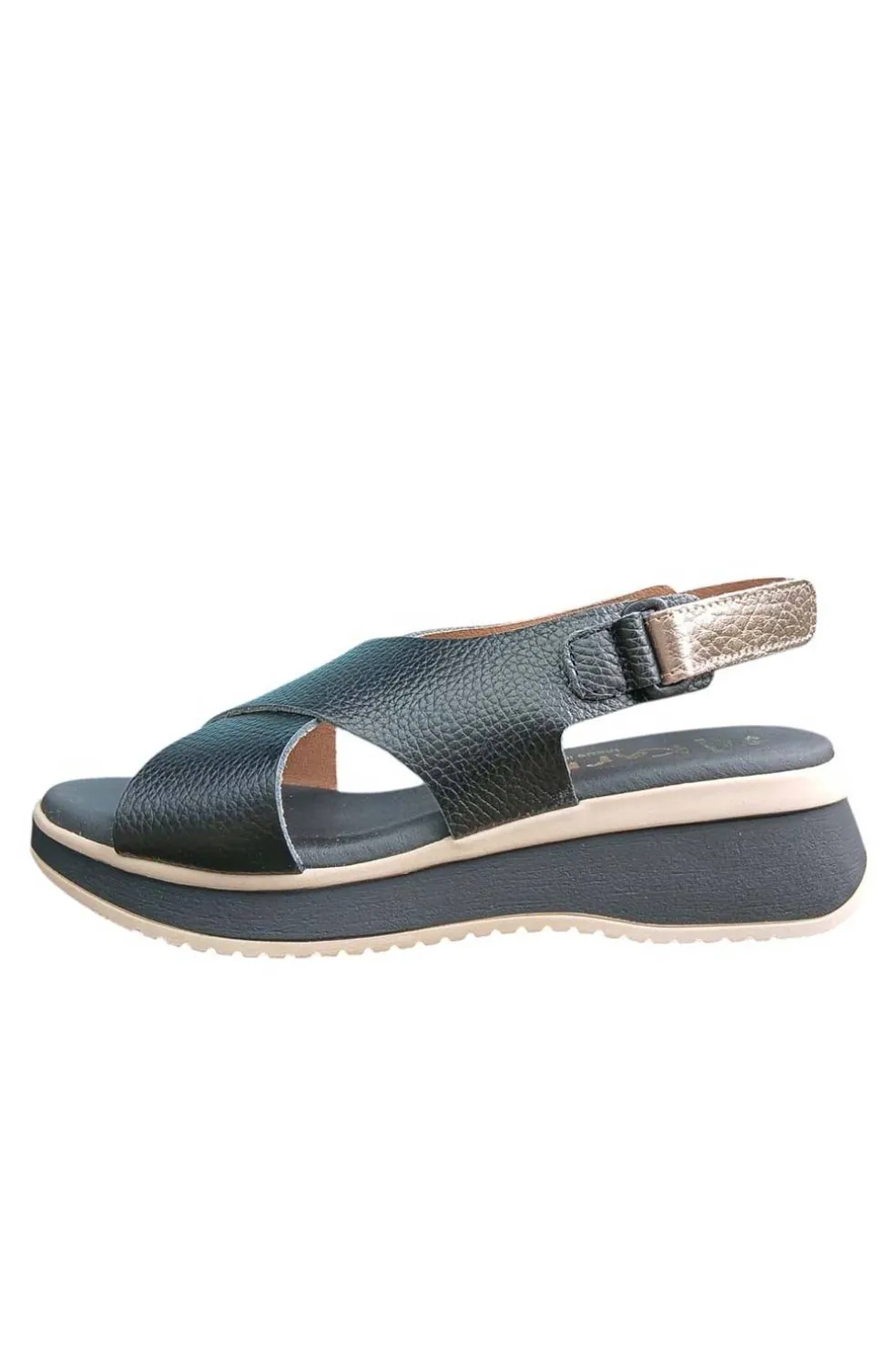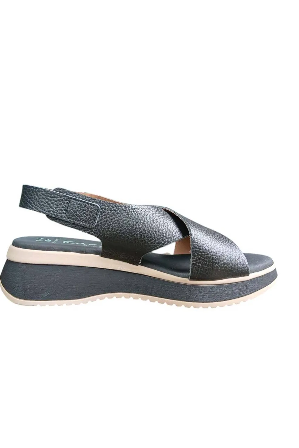 Sandalia de mujer fabricada en piel. Diseño con dos tiras cruzadas en color negro, suela bicolor. Plantilla de gel y su cuña de 4,5 cm.