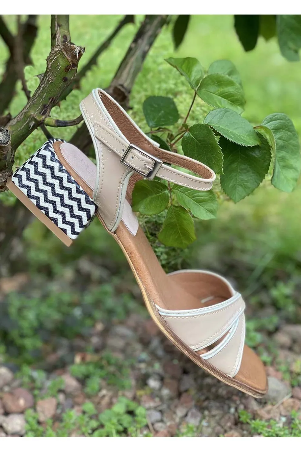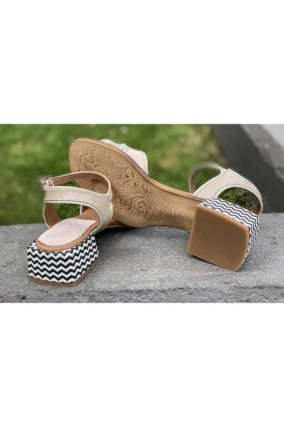 Sandalia de piel de la marca Nemonic. En tono beige, con llamativos estampados bicolor en blanco y negro en el tacón. La tira del cierre en el tobillo en charol. Tacón cuadrado, cómodo. Estas sandalias son ideales para darle un toque diferente y único a todos tus looks. Fabricado en España.
