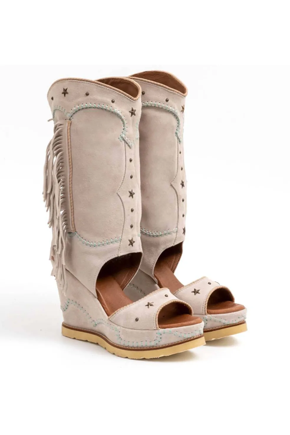 Si lo tuyo es un estilo boho desenfadado y libre, estas sandalias de piel anteada serán perfectas para combinar con todas tus faldas y vestidos. Su suela de plataforma y tacón forrado se completa con los flecos acordes con el estilo.