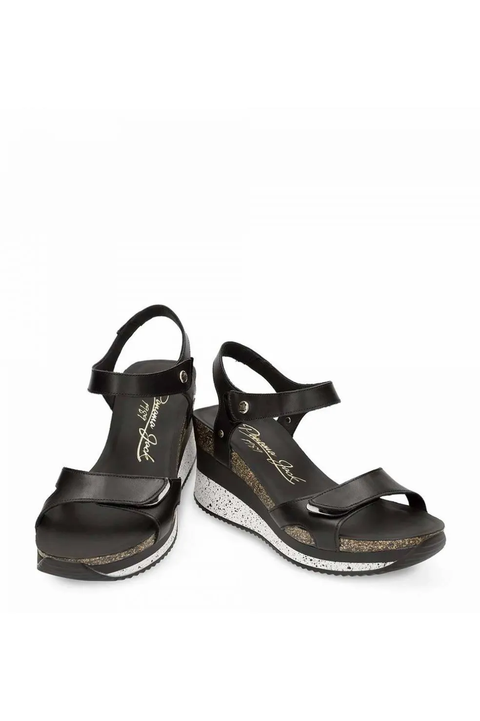 Sandalia de mujer con cuña Cierre de velcro. Piel Napa Negro. Forro interior de Piel. Plantilla anatómica. Suela de poliuretano, flexible y resistente. Altura tacón: 7 cm.