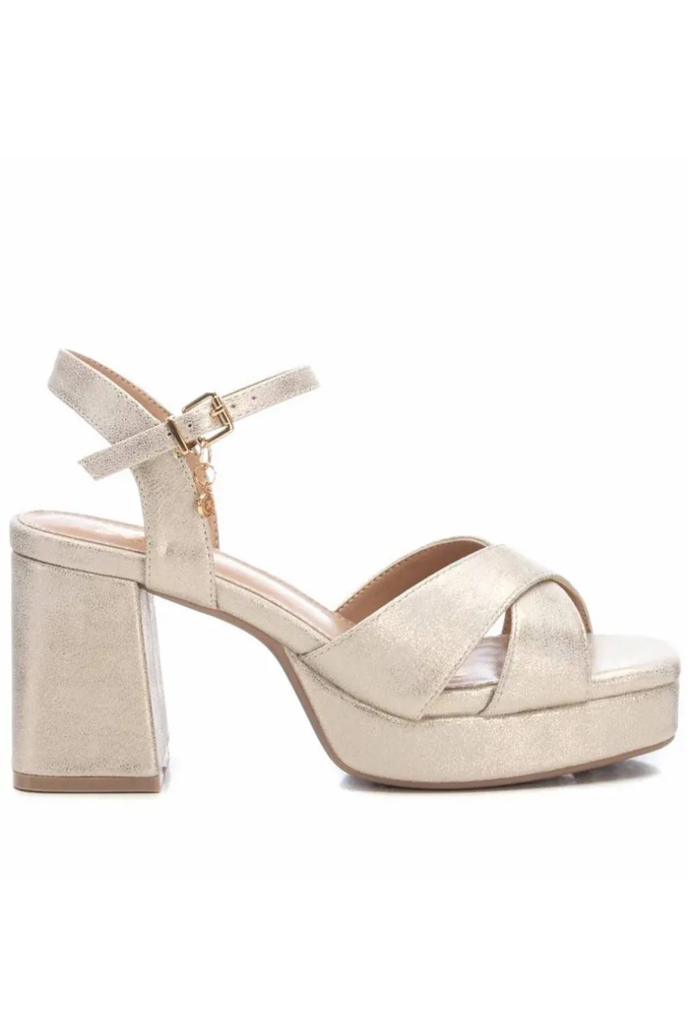 Sandalia de mujer, de la marca Xti. Fabricada en material imitación a piel, tipo charol. Modelo de pala cruzada. Pulsera con hebilla metalizada para ajustar el tobillo. Cómoda planta acolchada. Tacón de 9 cm de altura y plataforma delantera para más comodidad.