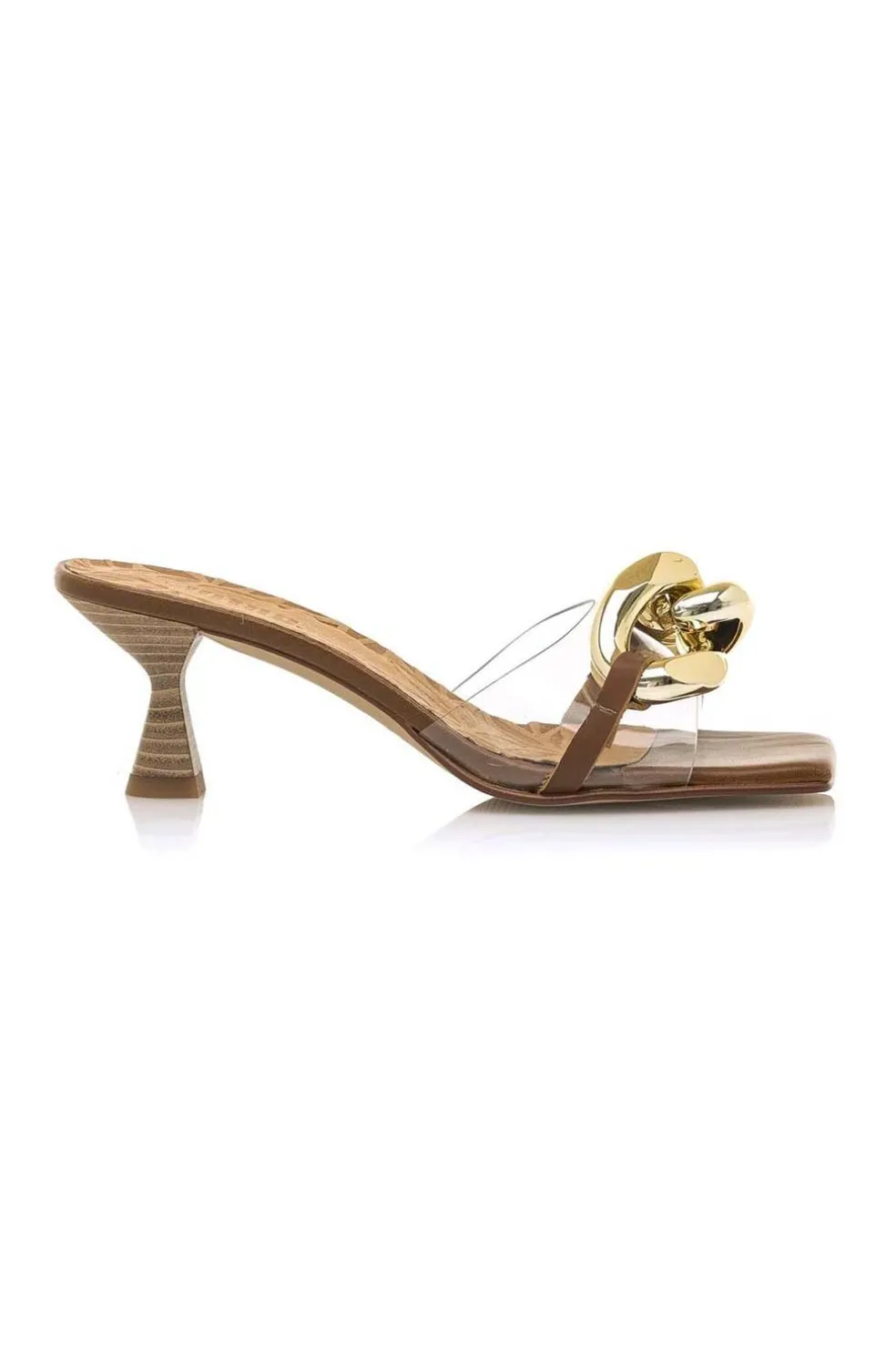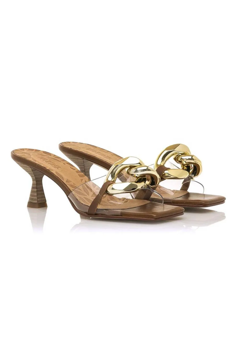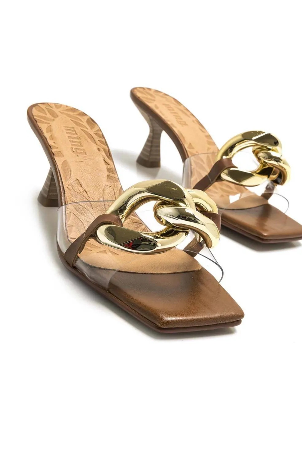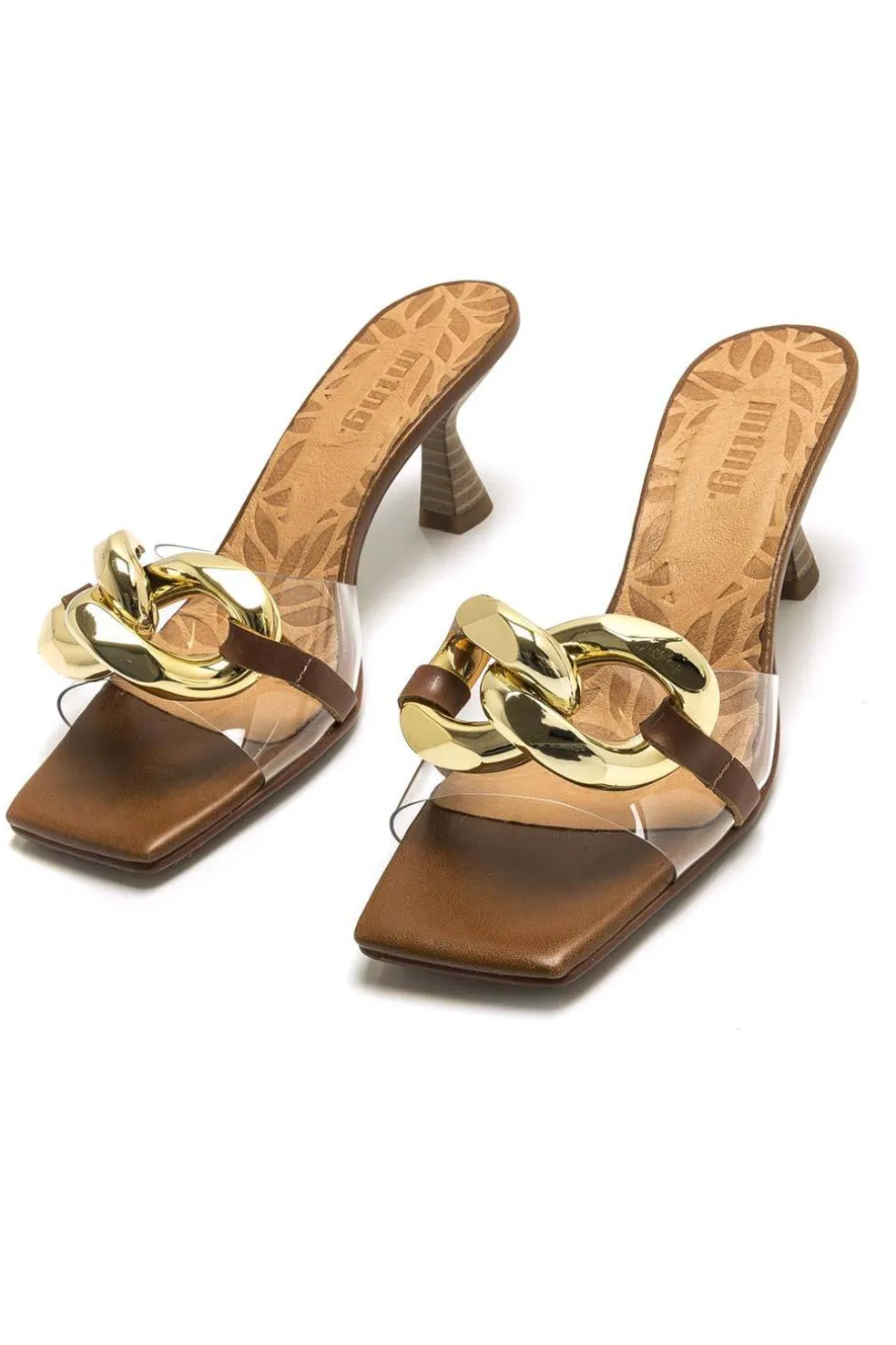 Sandalia de vestir de mujer mtng con pala de vinilo y detalle de eslabón en color dorado con detalles de tiras en piel de color cuero. Un modelo ideal para tus looks preferidos de temporada. 7 cm de tacón. Fabricadas en España.