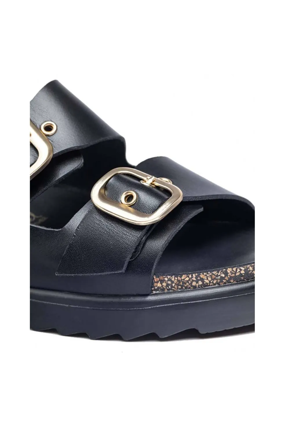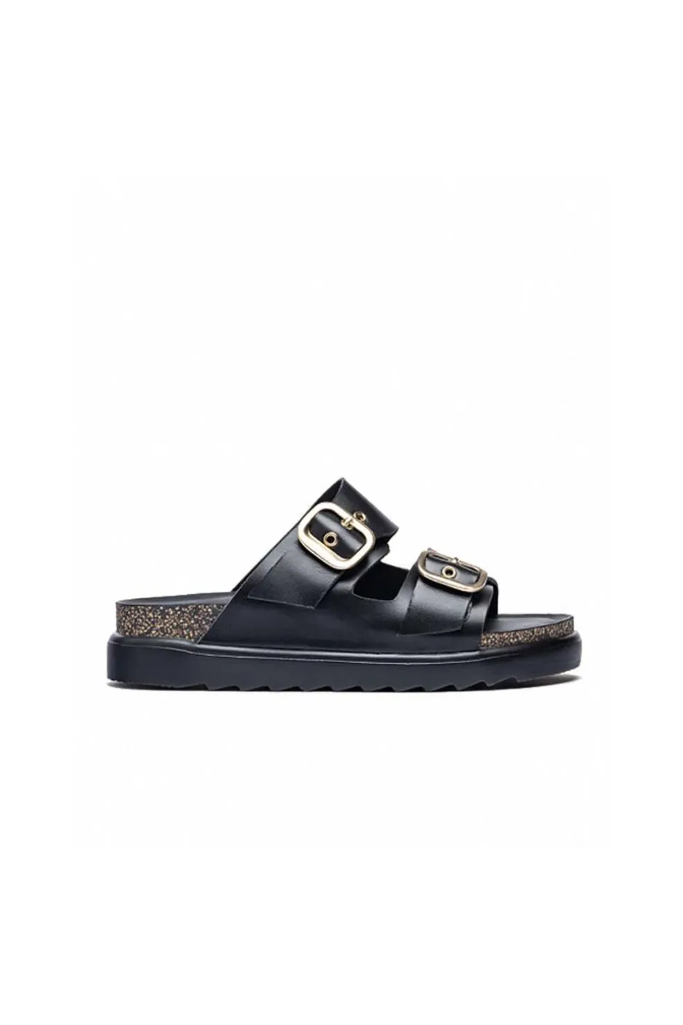 La sandalia de plataforma TUNEZ 130 en negro, la sandalia más sencilla de toda la línea TUNEZ. No cuenta con ningún tipo de cierre, pero sí con dos hebillas doradas en las tiras del empeine que permiten adaptarlas a tus pies. La sandalia de plataforma ideal para tus planes del día a día. Plataforma de 4 cm y una plantilla antideslizante que garantiza el agarre del pie.