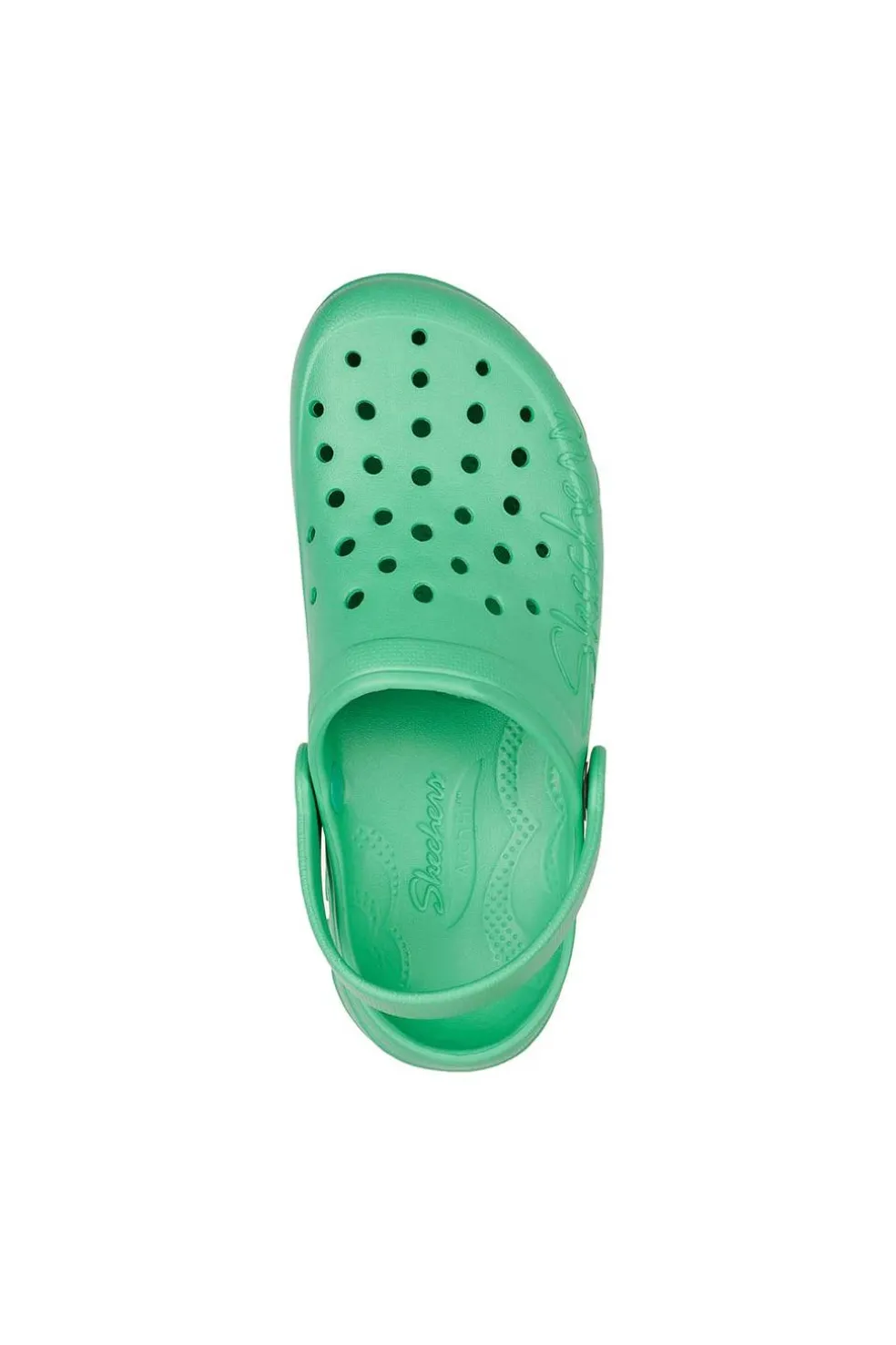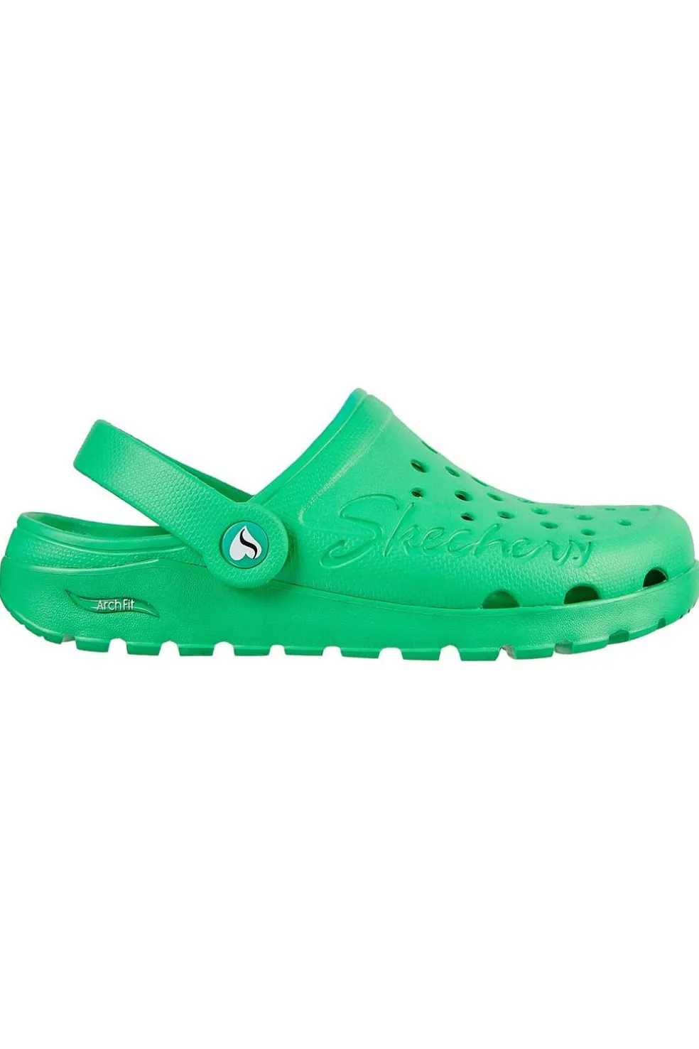 El estilo desenfadado viene con la comodidad de sujeción de las Skechers Foamies®: Arch Fit® Footsteps – Pure Joy shoe. Zuecos de estilo casual Slip-On, con talón descubierto, parte superior flexible de espuma EVA, plantilla Luxe Foam® y Arch Fit® con amortiguación.