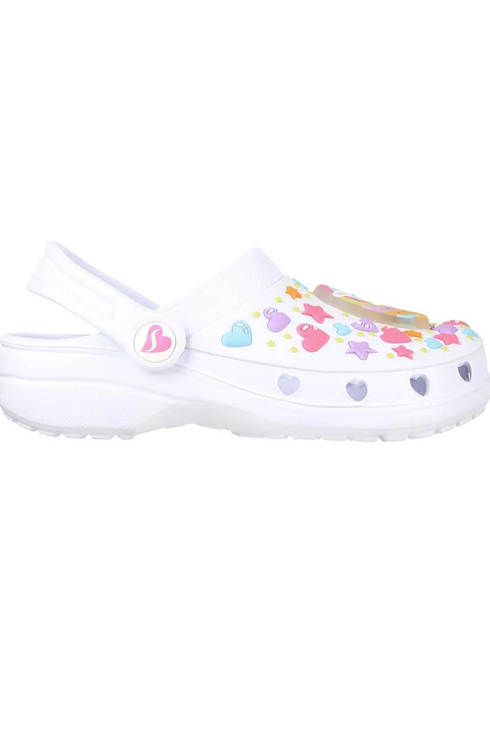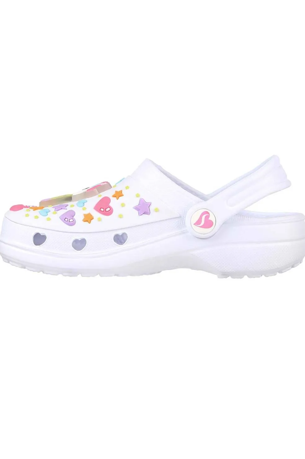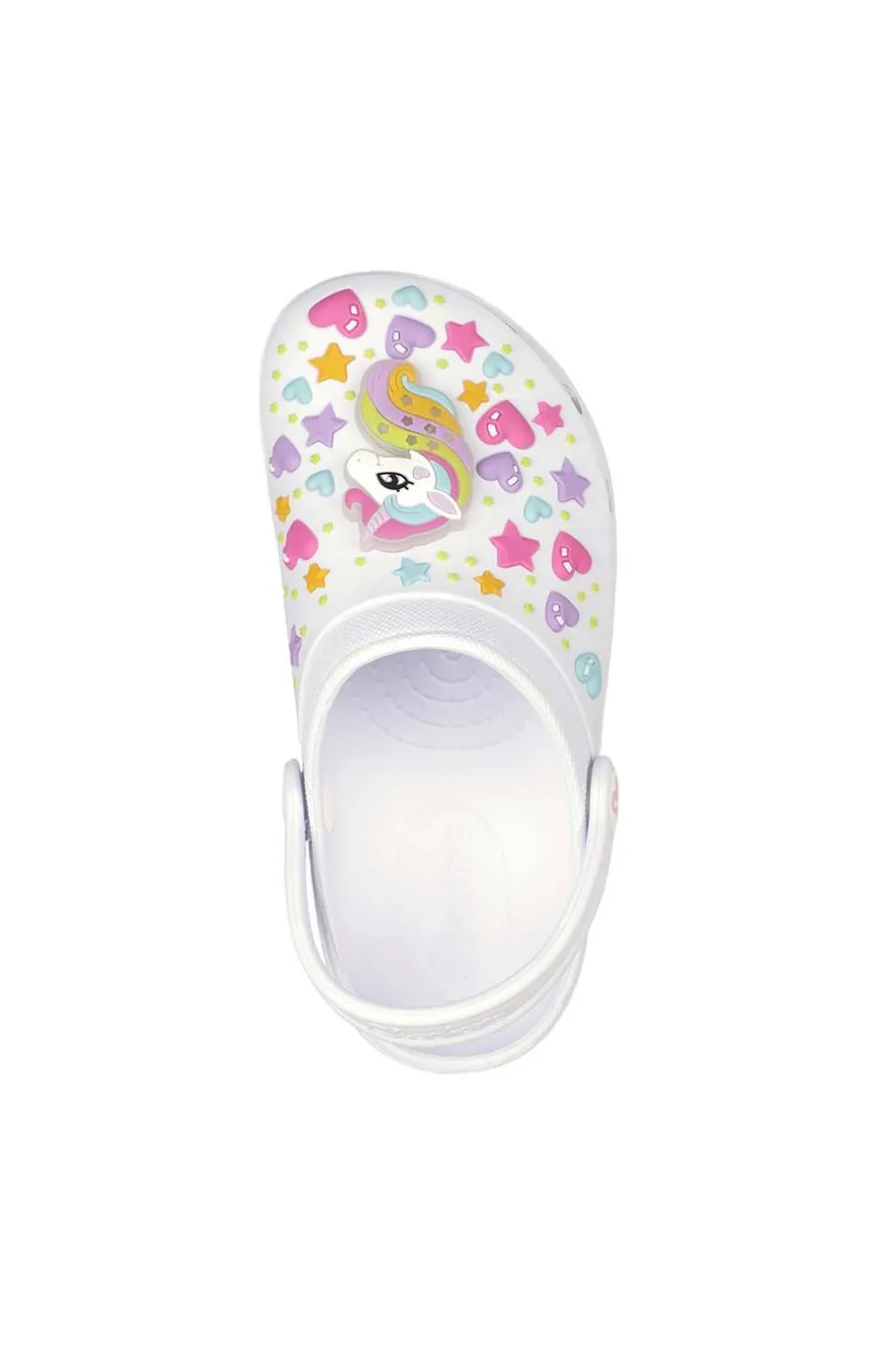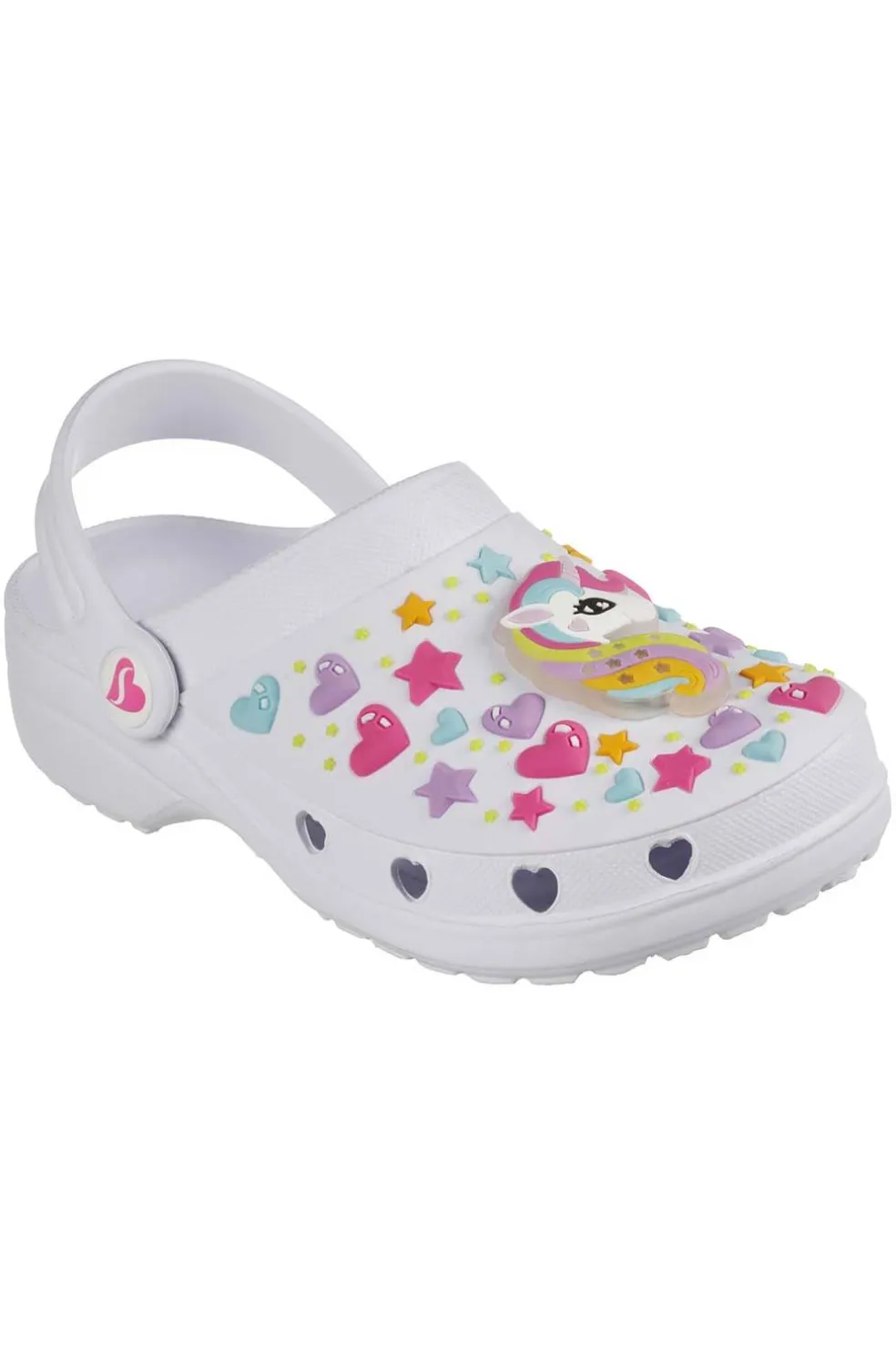 Ilumina la diversión mágica con el Skechers Foamies®: Heart Charmer – Unicorn Delight. Cómodos zuecos Slip-On moldeados con parte superior flexible de EVA perforado, luces, dibujo de unicornio y cierre convertible en el talón.