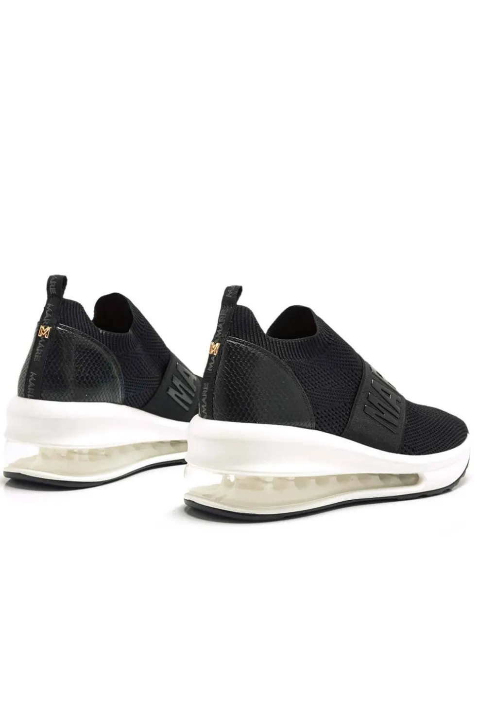 Deportiva de mujer Mariamare en color negro con cuña de cámara de aire trasparente combinada en diferentes texturas. Cierre de elástico ancho en color negro charol con las iniciales de la marca sobre el empeine.