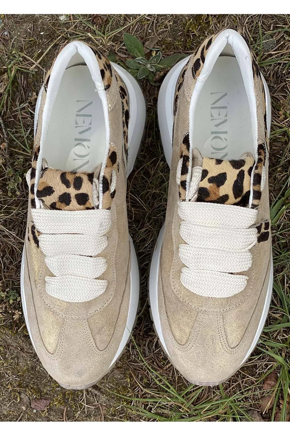 Sneaker Nemonic fabricado en piel en color dorado y detalle animal print leopardo. Es un piso nuevo con mucho estilo y que alza la figura, es muy cómodo y combinable . Cordones en beige. Fabricado en España