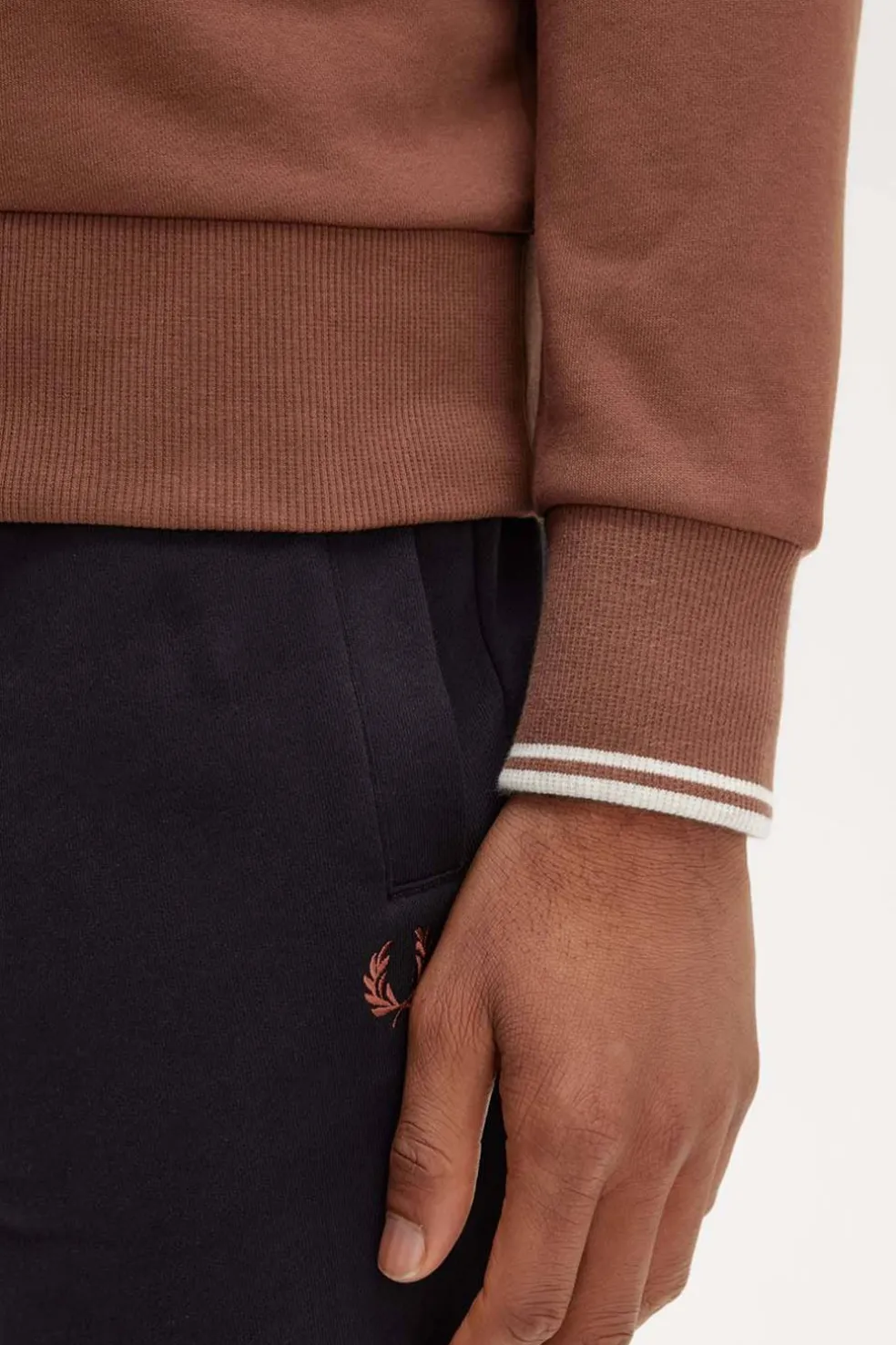 Ribete en los puños y la corona de laurel bordada en el pecho.