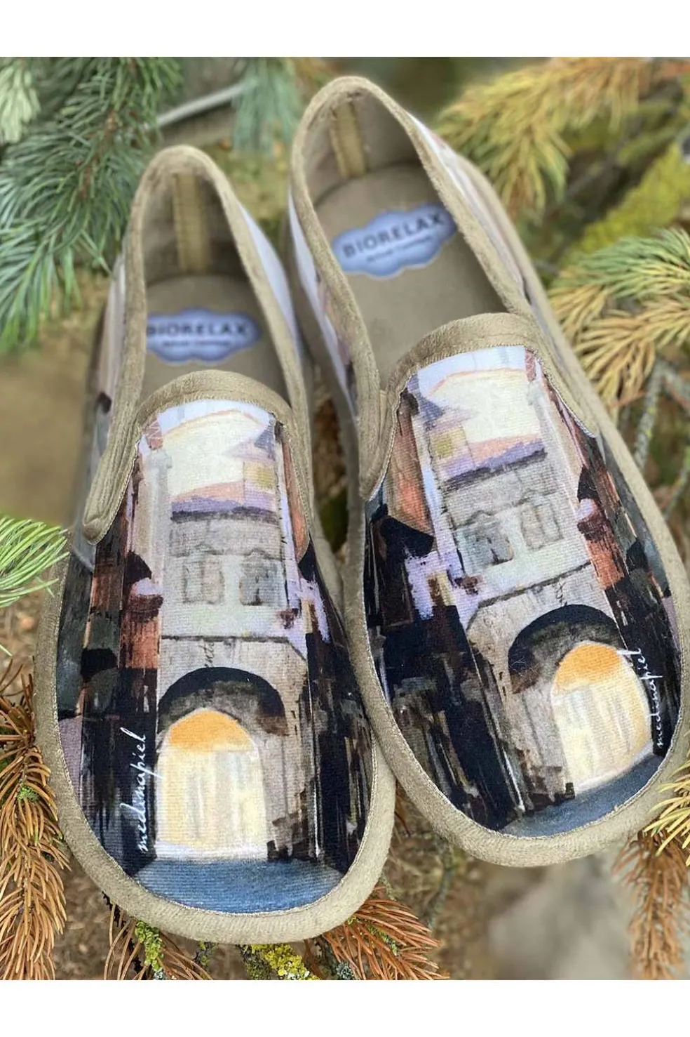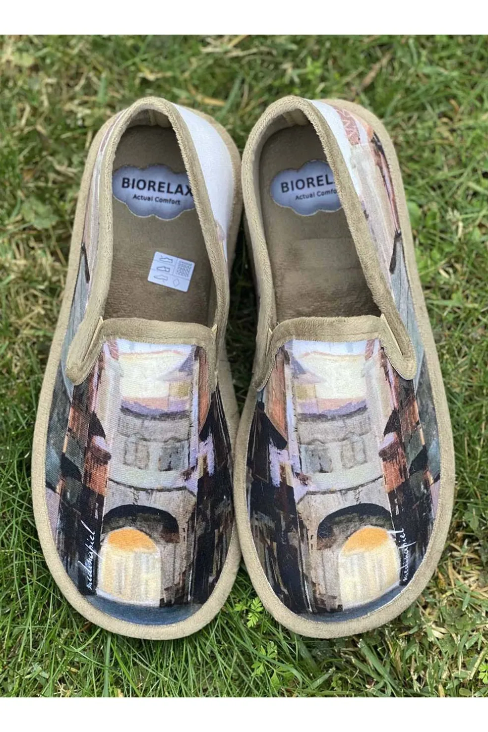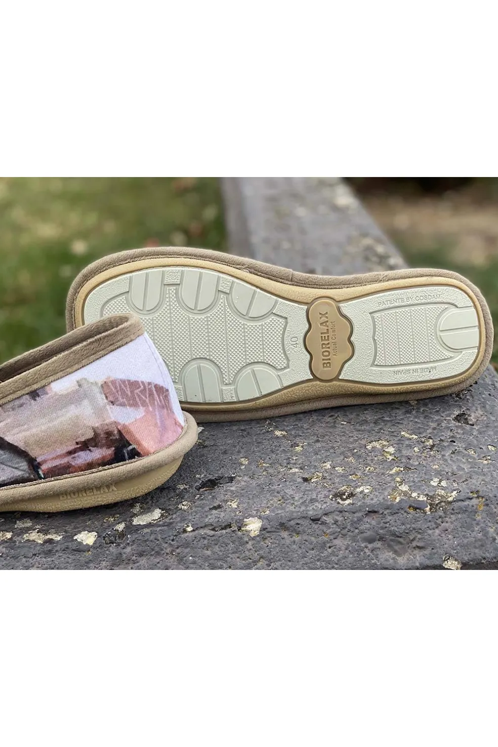 Zapatilla casa para hombre Biorelax con estampado de Medina de Pomar, esponja técnica con memoria en la suela y plantilla suapel. Motivo arco de la cadena calle mayor. Fabricado en España.