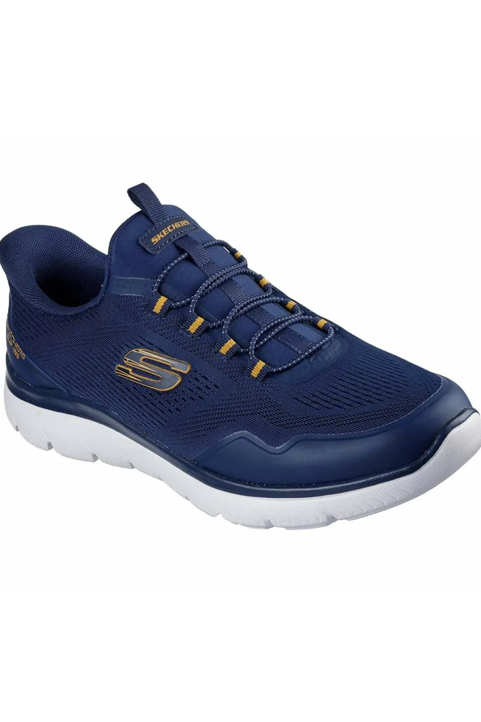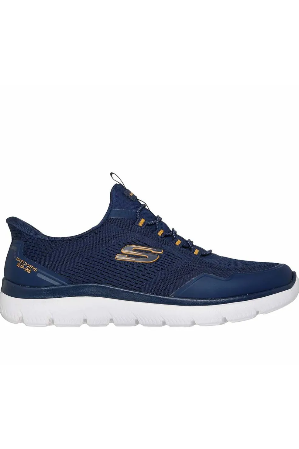 Disfruta de la comodidad de Skechers Hands Free Slip-Ins®: Summits – Top Rate. Diseñado con nuestro sistema exclusivo Heel Pillow™, este modelo slip-on casual vegano presenta una parte superior de malla técnica y capas superpuestas de material termosellado en 3D, cordones elásticos fijos y una plantilla con amortiguación Skechers Memory Foam™.