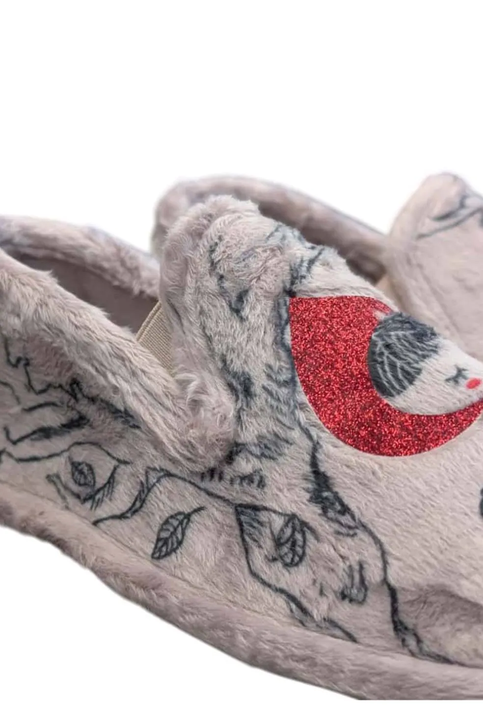 Zapatilla de casa Cosdam Biorelax para mujer, cerrada y elaborada con tejido suave y confortable. Su color gris piedra y el estampado de Caperucita y el lobo aportan un toque divertido y encantador, perfecto para disfrutar del confort en casa.