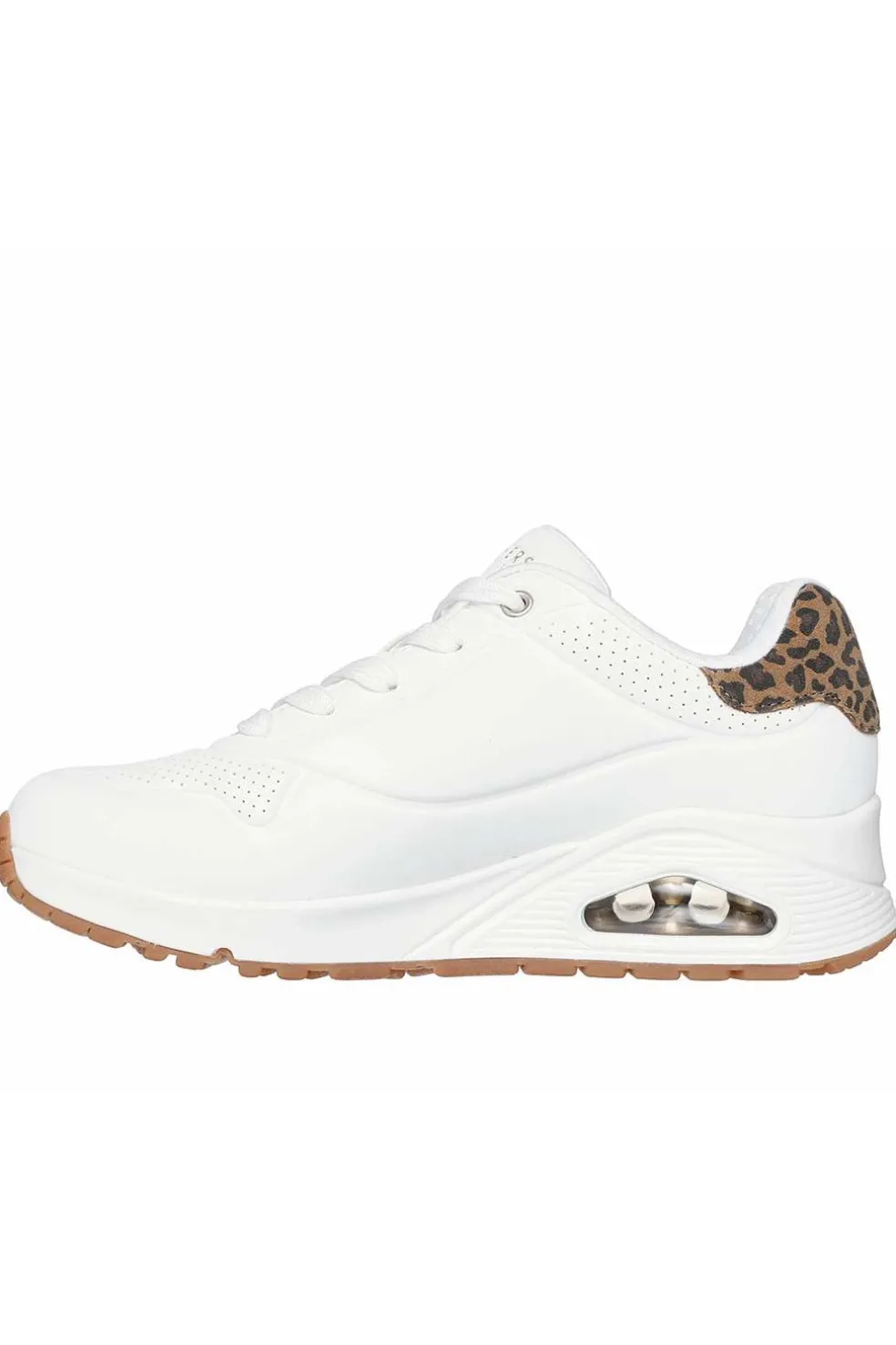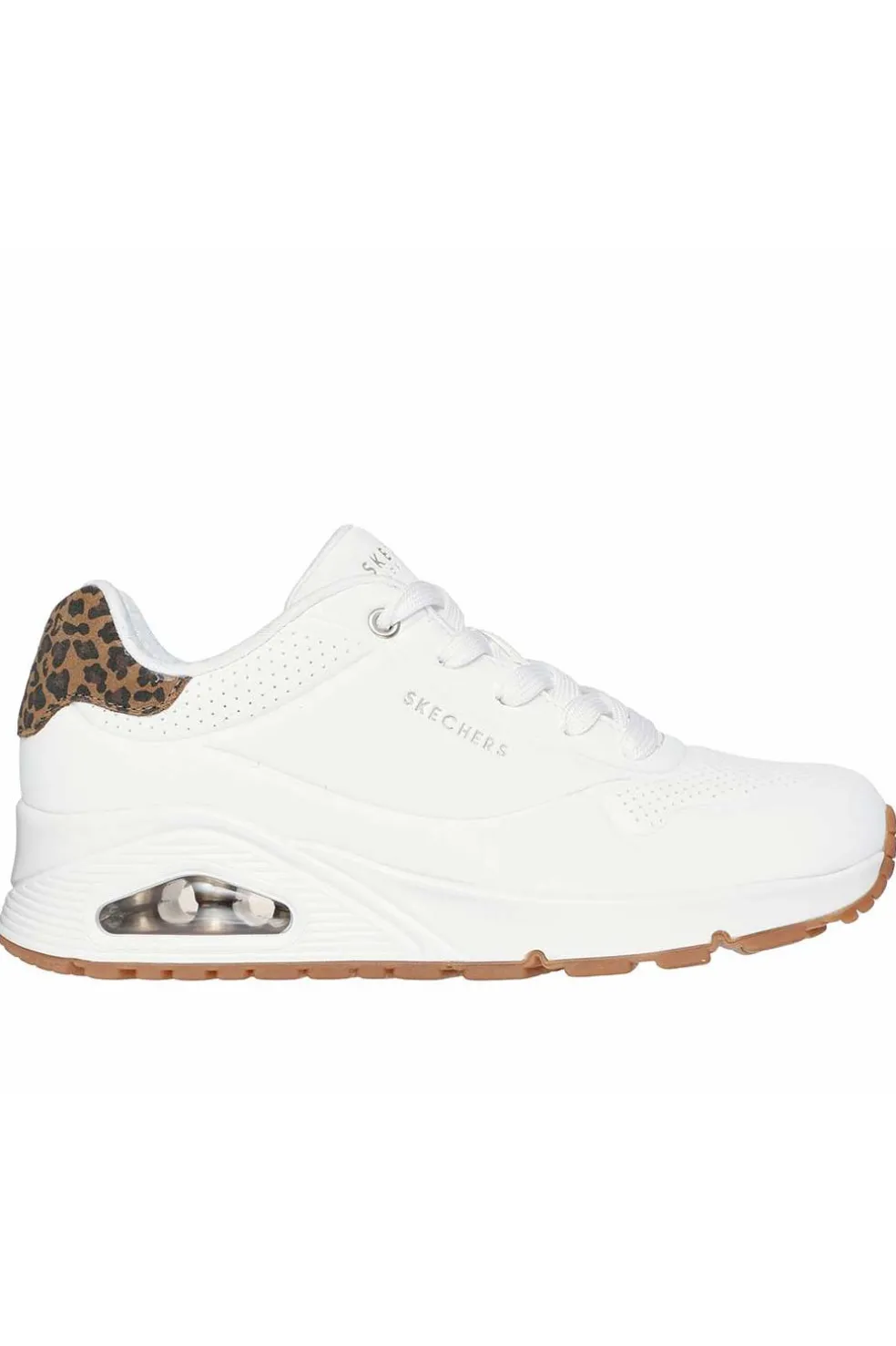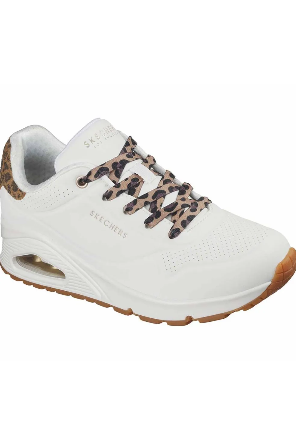 Anda sobre las nubes con la salvaje comodidad de las Skechers Street™ Uno – Jungle Nite. Esta moderna zapatilla con cordones presenta una parte superior de material sintético, talonera con estampado de leopardo, una plantilla Skechers Air-Cooled Memory Foam™ y una media suela visible Skech-Air® con cámara de aire.