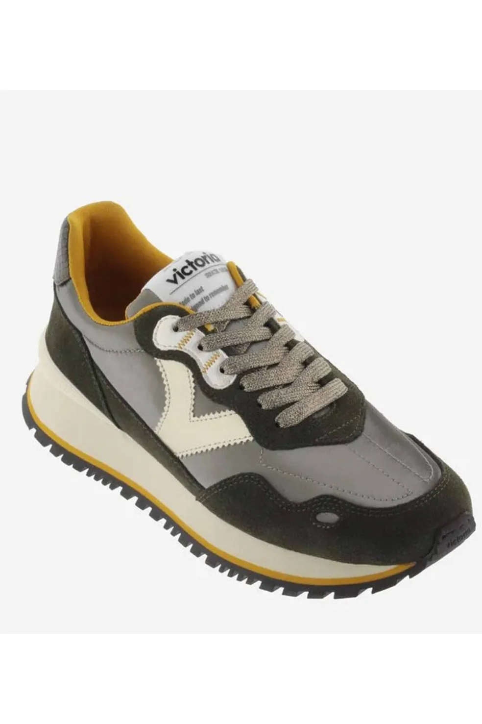 V del lateral y pieza trasera con el logotipo de la marca en efecto brillo metalizado. Cierre mediante cordones con fibras metalizadas. Su ligereza y carácter deportivo se ven realzados por detalles como la suela ancha, el estabilizador del talón y el patín negro en relieve antideslizante, que favorece un mayor agarre.