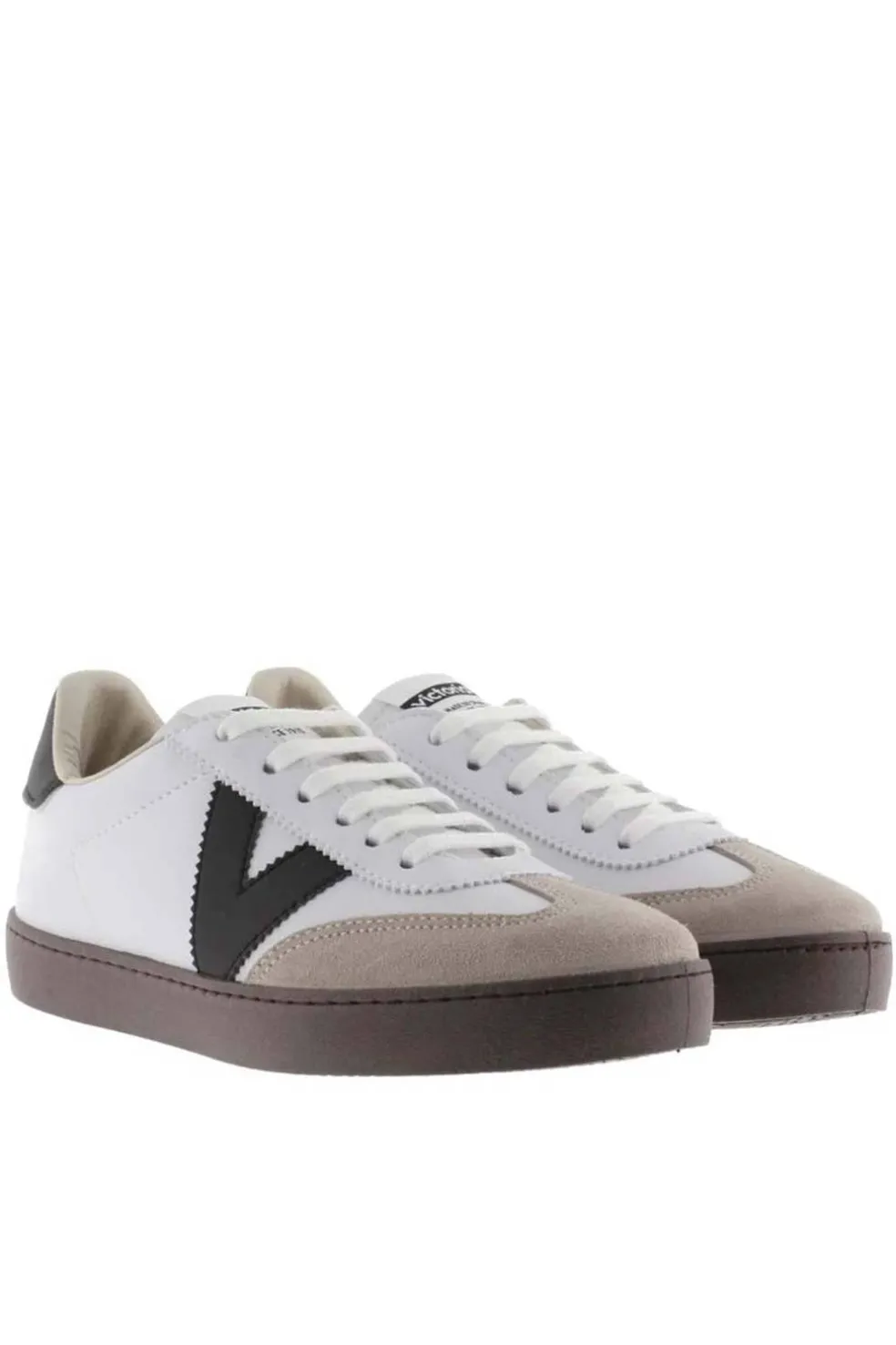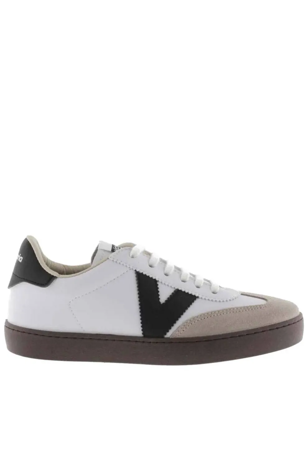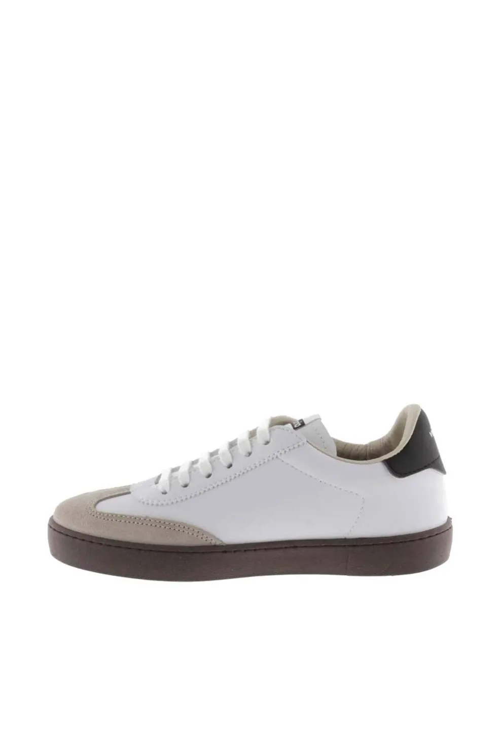 Zapatillas deportivas blancas para mujer de corte ciclista, fabricadas en material efecto piel y pieza de serraje en la puntera. Logo impreso en la trasera y V negra en el lateral al tono. Suela marrón chocolate compuesta por aceites vegetales en lugar de minerales reduciendo así el impacto medioambiental. Incluye una plantilla más ergonómica confeccionada a partir de materiales reciclados.